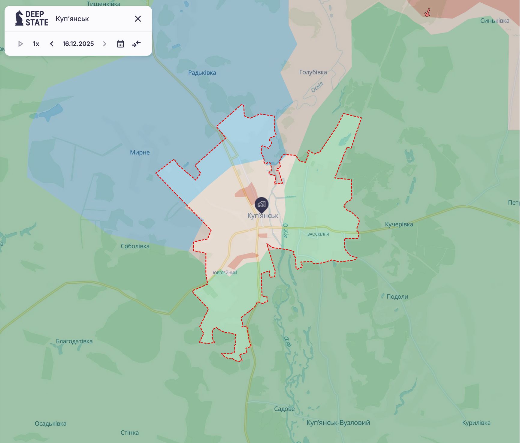 Также несколько раз российские военные сообщали о взятии райцентра Купянска в Харьковской области; впервые — в конце ноября. Но 12 декабря в Купянске побывал Владимир Зеленский и снял видеоролик на фоне стелы при въезде в город. Российские источники пытались объявить этот ролик фейком или заранее записанными «консервами»; об этом The Insider уже писал в рубрике «Антифейк». По данным DeepState, небольшая часть города в зоне боев, остальное под контролем ВСУ. Население на 1 января 2022 года было 26627 человек.