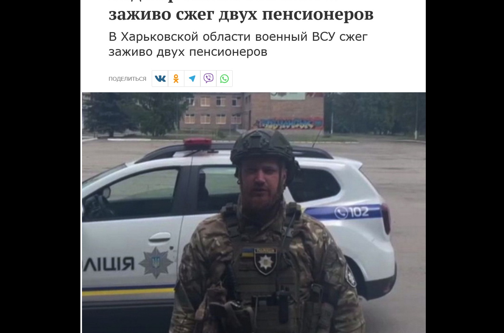 «Московский комсомолец» и Rambler сообщают об очередном злодеянии украинских военных. В заметке под заголовком «Под Харьковом боевик ВСУ заживо сжег двух пенсионеров» говорится: