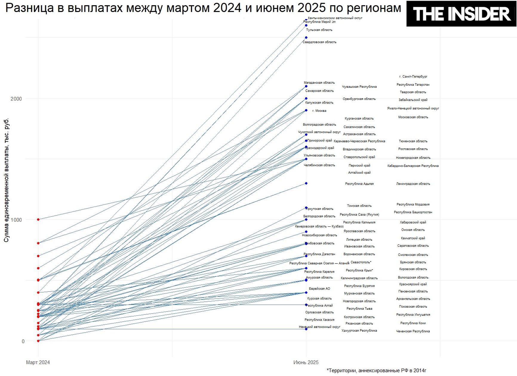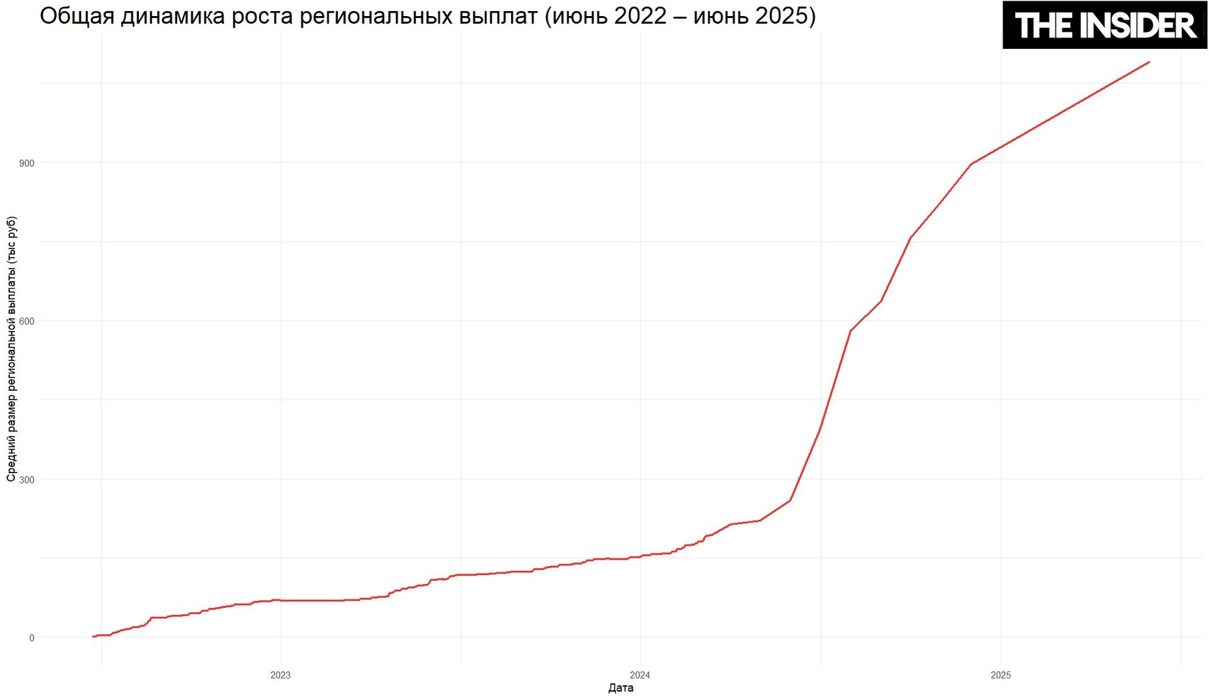 Судя по данным за июнь 2025 года, эта разница сохранилась. В регионах с оборонными предприятиями в декабре 2024 года выплаты были выше на 280 тысяч рублей, а в июне — уже на 330 тысяч. Это может говорить о том, что регионы с ВПК активнее вовлечены в вербовку военных, получают больше ресурсов или стремятся компенсировать конкуренцию за кадры между заводами и фронтом. То есть у регионов появилась новая специфика — участие в военной экономике.