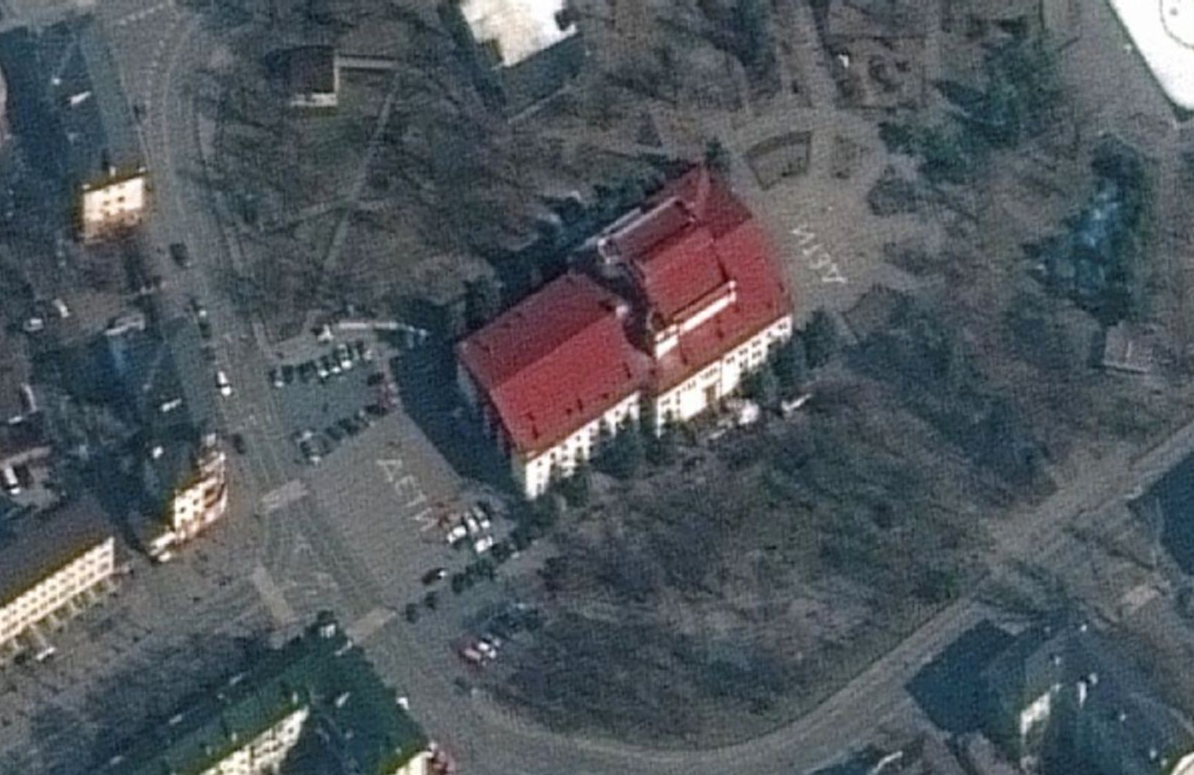 According to satellite imagery, large signs saying «children» were installed in front of the theater facades to warn the Russian bomber pilots. Apparently, the warning did not work.