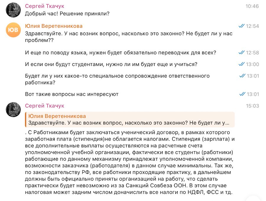 Posing as an interested party, journalists from The Insider posted a message seeking labourers to work for an industrial concern. Within hours, MMC head Sergei Tkachuk responded personally, outlining the conditions for bringing North Korean migrants into the country.