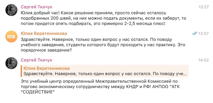 The United Nations takes violations of its sanctions on North Korea seriously — so much as requesting North Korean labor can carry consequences. Some Russian clients provided full names and contact details in their inquiries, while others attempted to remain anonymous. The Insider was able to identify many members of the Telegram group that was set up for companies looking to request workers.