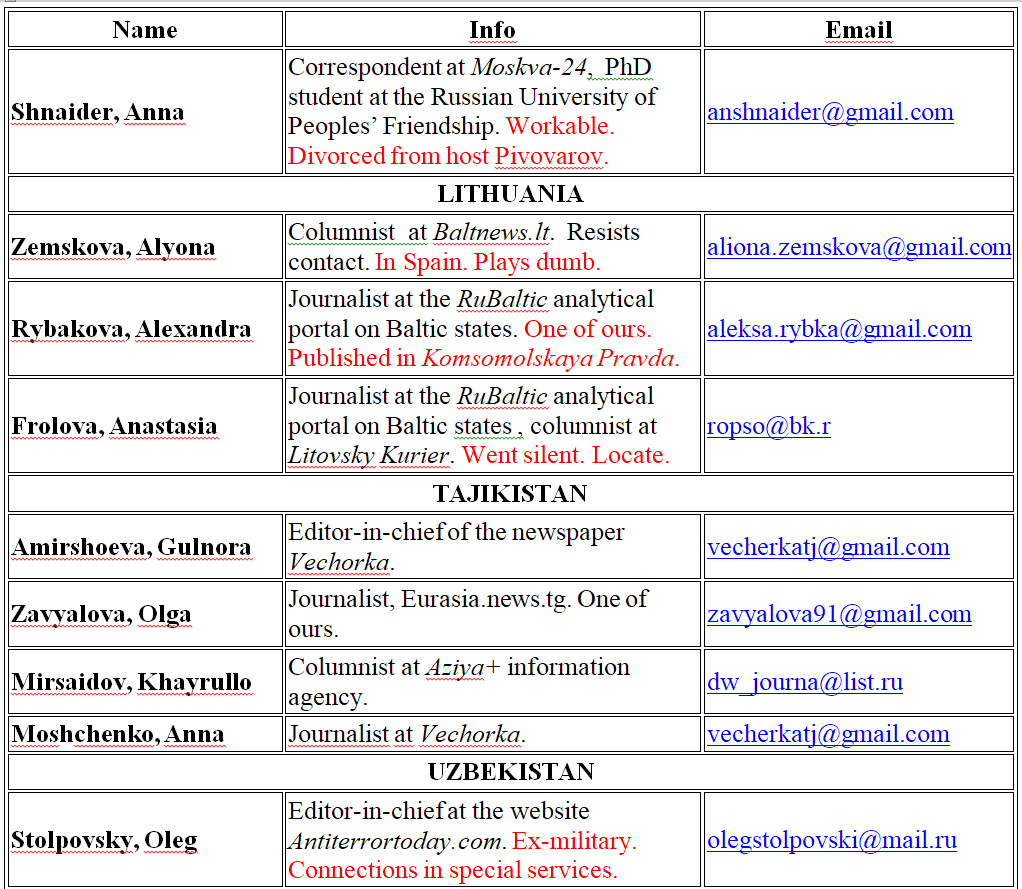 In the meantime, the directorate spared no effort to engage journalists from neighboring countries, assessing them for potential roles as agents of influence. The lists from the cultural ties directorate (available to The Insider) included 136 media representatives and bloggers. Some of the candidates’ names were accompanied by notes such as: “promising,” “workable,” “ours,” “played dumb,” “turned,” “only after money, workable,” “rowdy, might start a fight at events.”