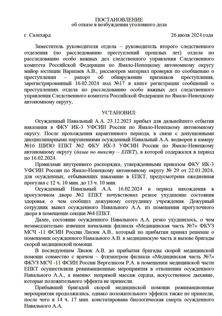 “This is a resolution of the Investigative Committee for the Yamalo-Nenets Autonomous District. It is signed by the same Major Varapayev, who refused to give Alexei's body [back] to his family and attempted to blackmail his mother into agreeing to a secret funeral. [...]I know that's not true. I know that Varapaev's ruling is a lie and they are covering up what really happened on that day. We know very well that when Alexei became ill, he was taken not to the medical center, but back to his punishment isolation [SHIZO] cell. That he died there, alone. That he was taken to the infirmary unconscious. That in the last minutes before his death he complained of a sharp pain in his stomach. Why isn't all this in the Investigative Committee’s ruling? Where is the footage from the cameras, which are everywhere in the [penal] colony, including the toilets? Where is the footage from the body cams of the prison staff who locked the dying man in the concrete box of the punishment cell?”The contents of the Investigative Committee's letter (in Russian) can be found below: