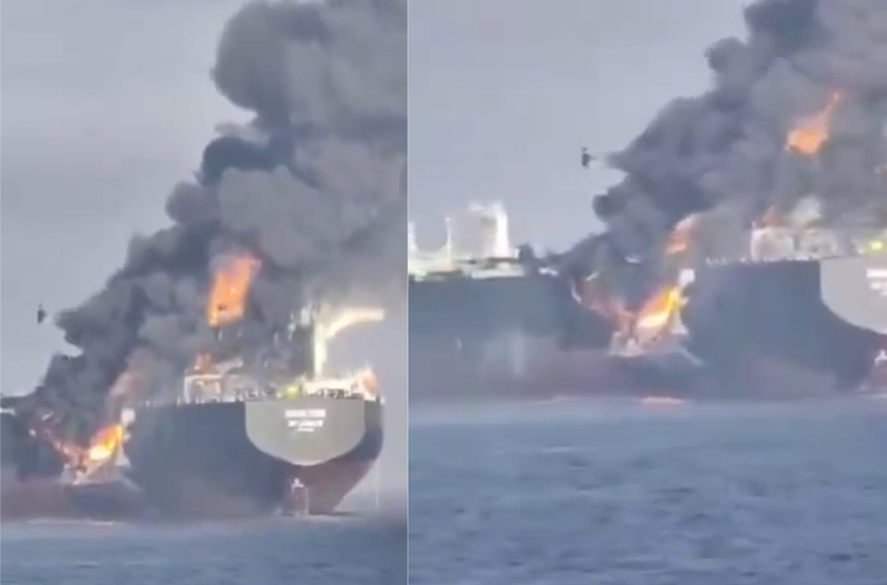 Screenshots of video footage showing the tanker Adalynn ablaze after a collision with another tanker in the Gulf of Oman. (Screenshots: @BlackSeaStrategyInstitute, Telegram)