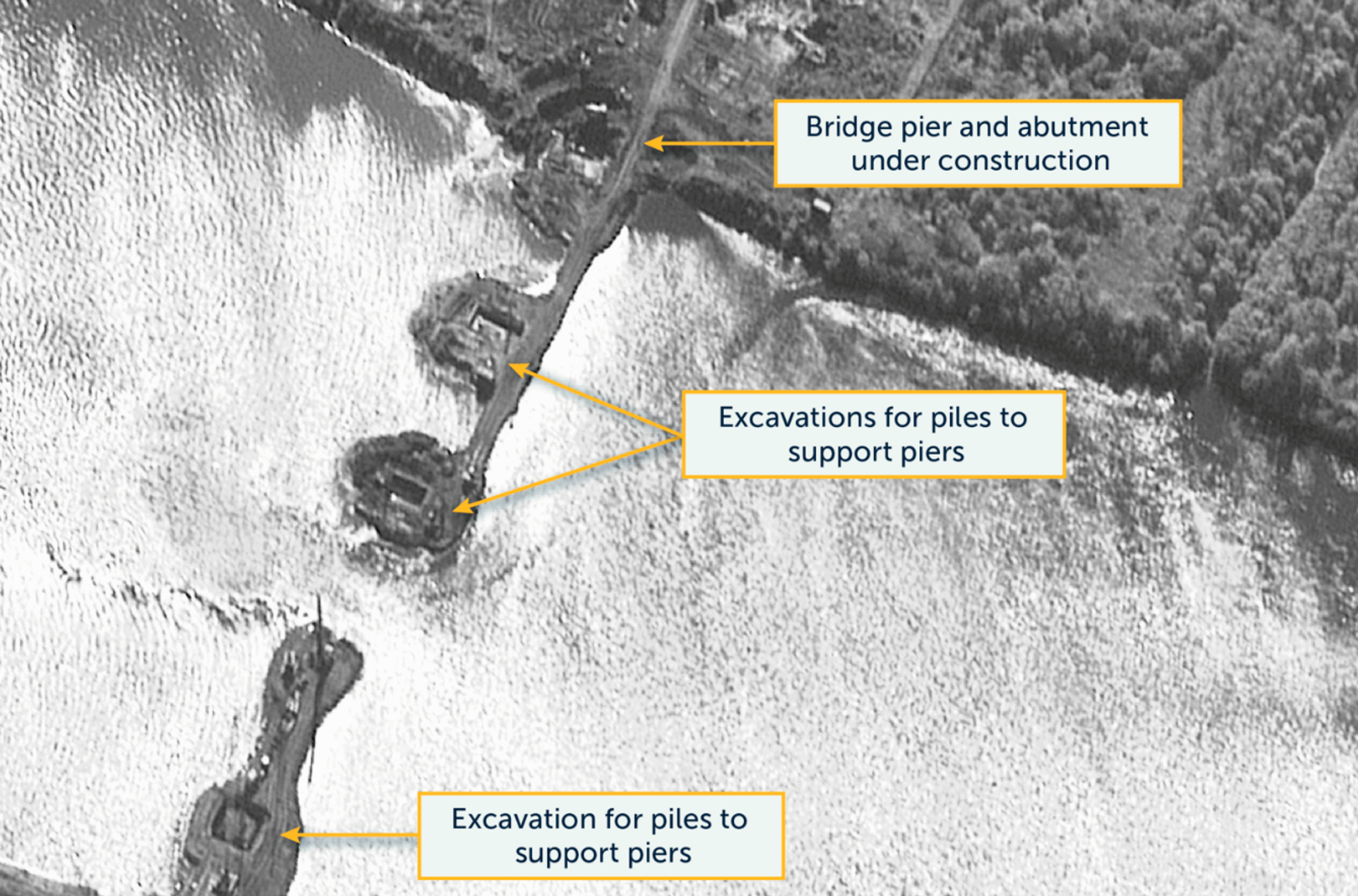To support the project, Russia has established a large supply base and a temporary concrete production plant roughly one kilometer north of the site. It has also begun building a 1.9-kilometer access road from an existing route leading to the border village of Khasan.