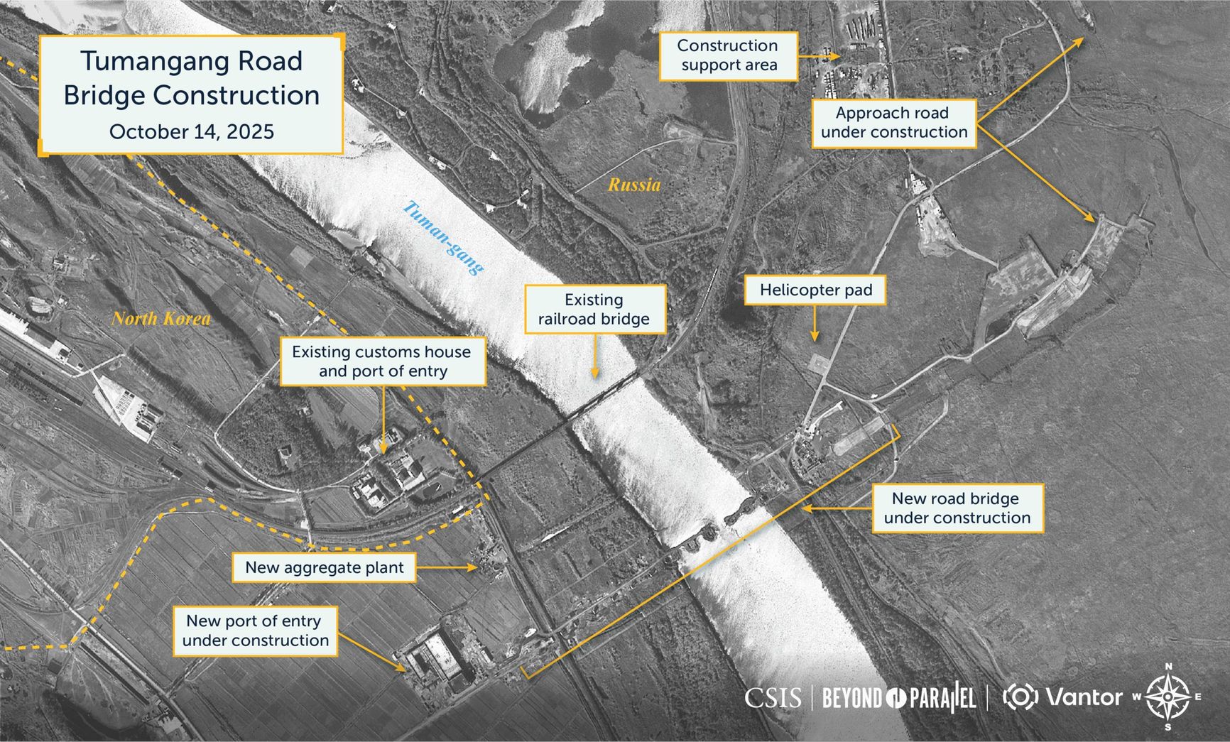 A new road bridge is under construction across the Tumen River, which marks the shared border between Russia and North Korea. The Washington-based Center for Strategic and International Studies (CSIS), which analyzed recent satellite images, noted that the new bridge will stretch at least 1.3 kilometers (0.8 miles), located south of the existing rail bridge connecting the two countries. Analysts predict that the bridge and related infrastructure could open as early as the first quarter of 2026.