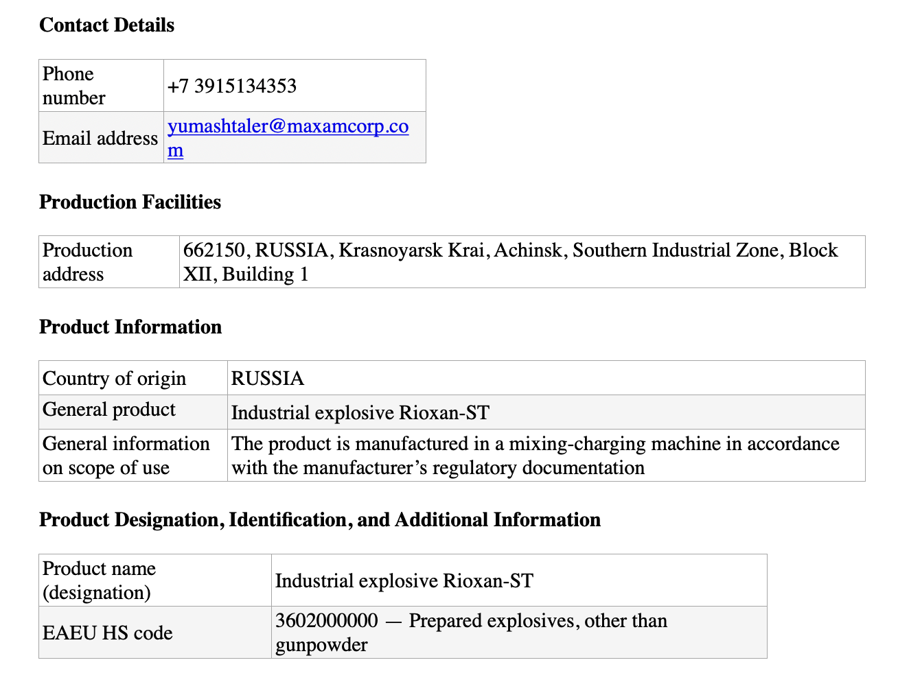 A number of facts indicate that the Spanish corporation maintains ties with these Russian plants. In 2023, YUII-Sibir paid 40 million rubles ($509,500) in dividends to its sole owner, MaxamCorp International, S.A. In April of that year, Maxam Rus filed a patent application for an industrial mixer used in the production of explosive compositions. The listed inventors of the device are two MaxamCorp managers, Raquel Vivanco González and Fernando Beitia Gómez Segura. Certificates for explosives produced by Maxam’s Russian plants list contact email addresses with the company’s corporate domain name.