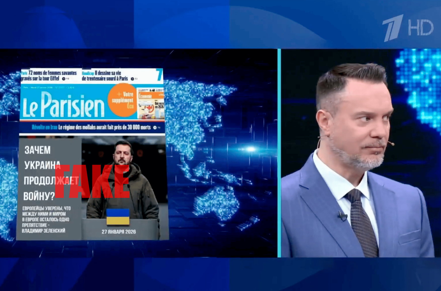 On Jan. 29, the “Vremya Pokazhet” talk show on Russia’s Kremlin-controlled Channel One (Perviy Kanal) presented “proof” of what the program’s host said was criticism directed against Ukrainian President Volodymyr Zelensky by the French press. The covers of two French newspapers — Libération and Le Parisien, both showing the date Jan. 27 — were presented on screen to corroborate his allegations. However, it later emerged that the front pages displayed on Russian television were fabrications created and spread by the “Matryoshka” bot network, according to analysis conducted by the Bot Blocker project.