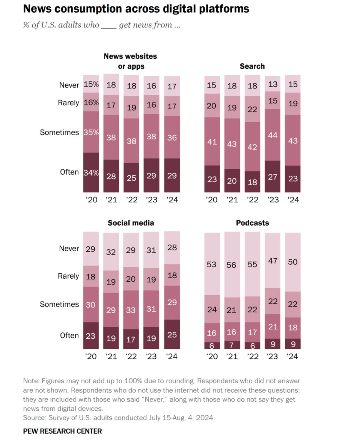 More often than not, the average American learns the news by scrolling down the feed on their phone. Technically, news sites are still ahead of social media as a source of information, but this statistic should be taken with a grain of salt, as “news sites” are increasingly consumed in the form of headlines offered to them on social media. Even if a reader takes the trouble to follow the link, they will read at best two or three sentences of the article before getting back to their doomscrolling.