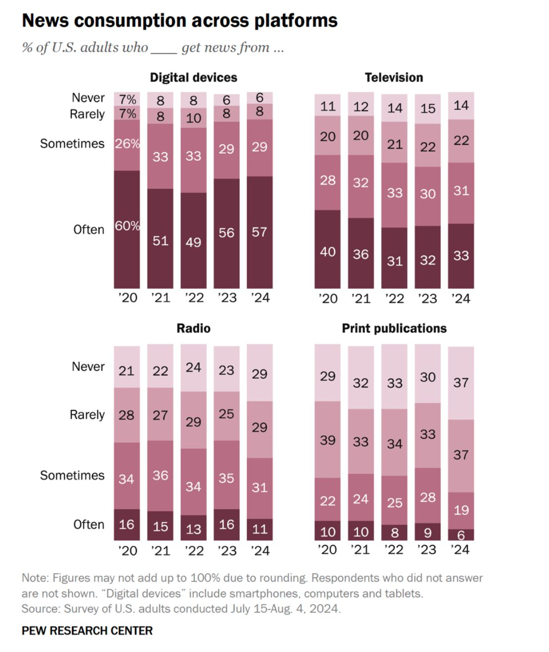 Mass media are losing influence not only because of a general decline in trust but also because of a massive shift in the way audiences consume information. In 2023, YouTube overtook television in audience size for the first time in the U.S. — a trend shared by other Western countries. Following YouTube, social media has also overtaken television in terms of reach.