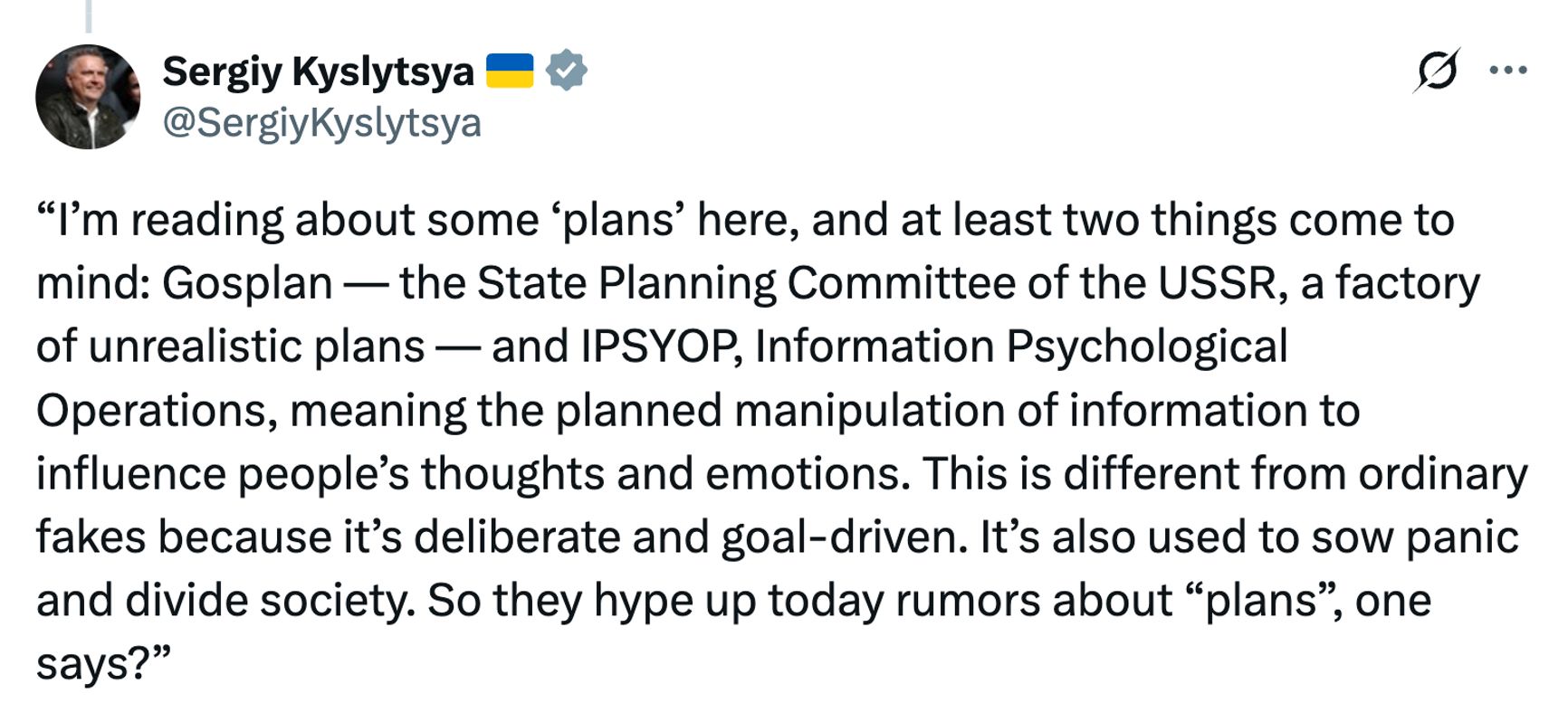 Unsurprisingly, when the fruits of Dmitriev’s labor were first made public, the response from Kyiv was less than approving. Ukraine’s Deputy Foreign Minister Sergiy Kyslytsya tweeted in response to the initial Axios article that the rumored 28-point “peace deal” reminded him of Soviet active measures — the “planned manipulation of information to influence people's thoughts and emotions…to sow panic, to divide society.”