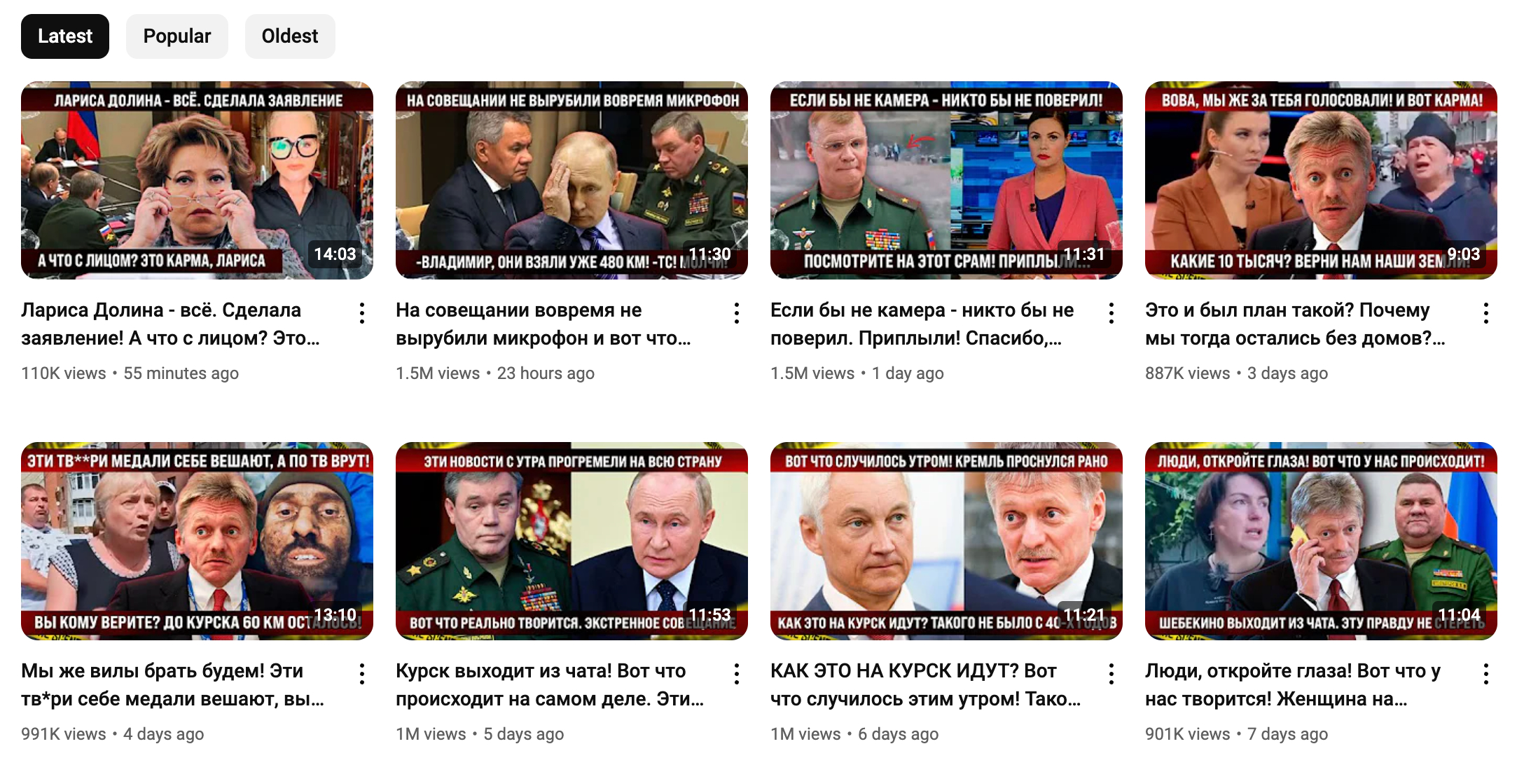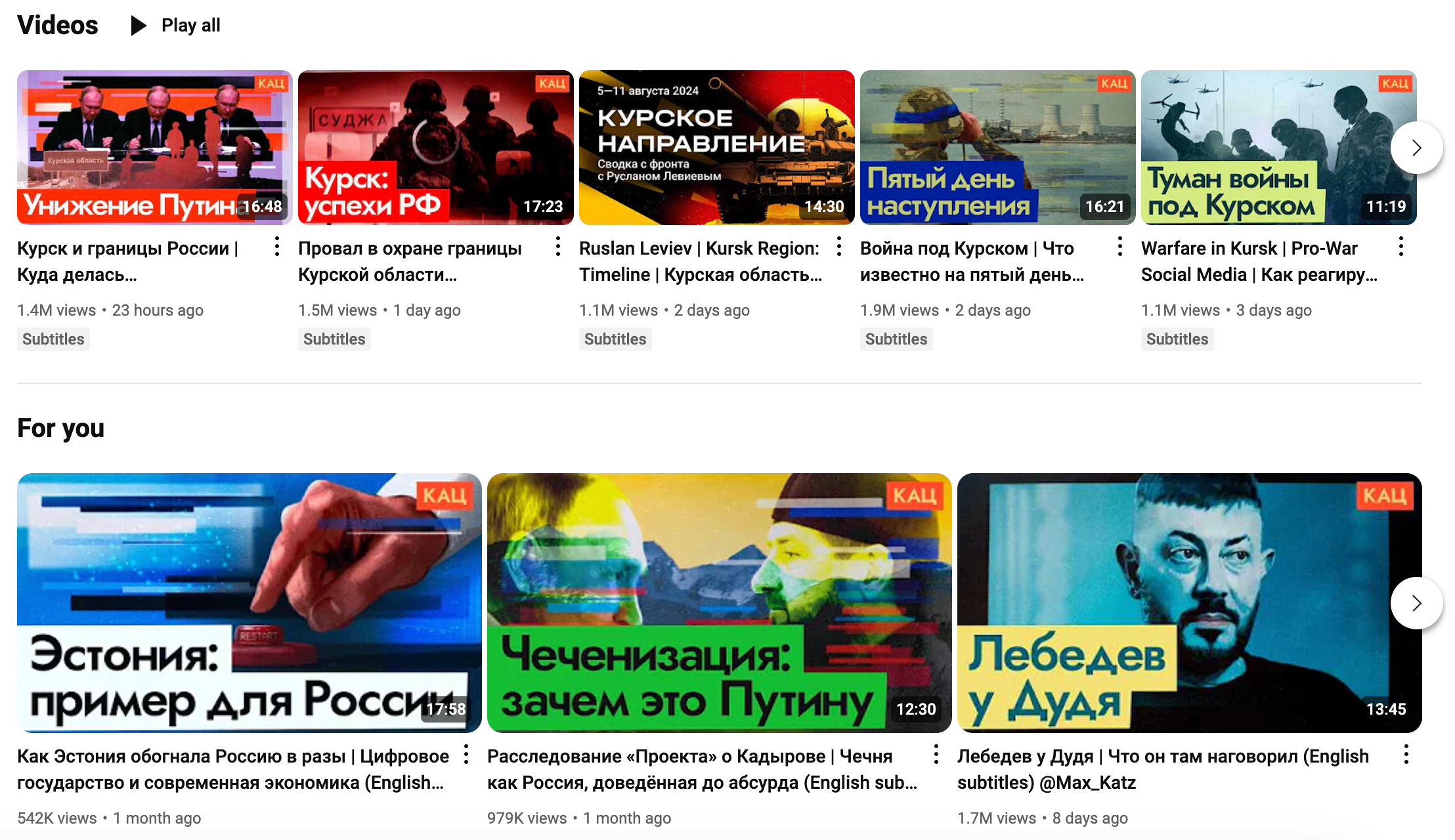 Pro-Kremlin YouTube channels, in contrast, struggle to gain similar traction. The most popular pro-government YouTube channel, run by the Komsomolskaya Pravda tabloid, has far fewer views, and many of its most popular videos involve non-political content. Even prominent propagandists like pro-war news anchor Vladimir Solovyov and RT editor-in-chief Margarita Simonyan failed to attract large audiences before their channels were banned.