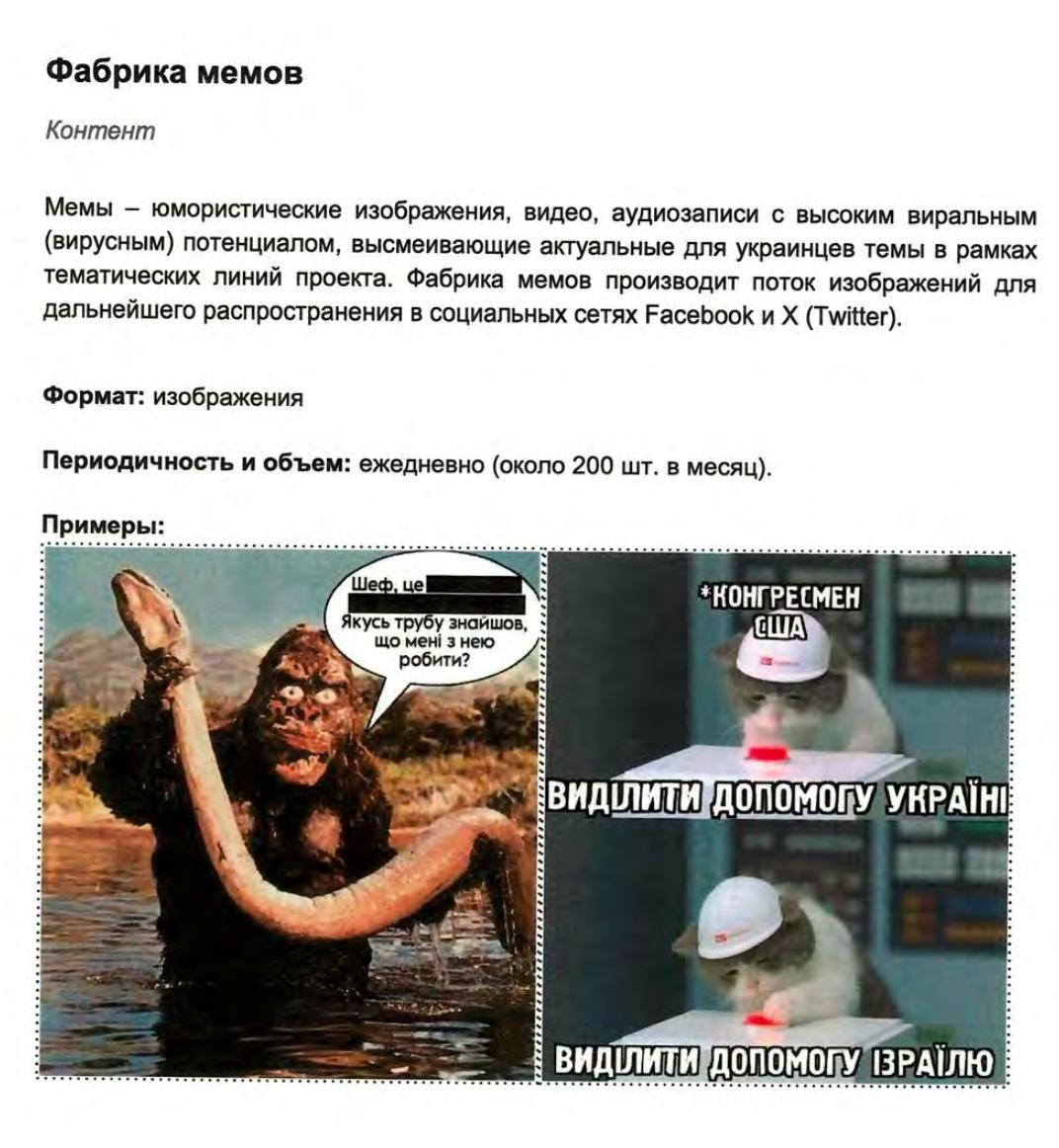 Одним из типичных приемов АСП стало распространение через сеть ботов фейков от лица уважаемых западных изданий — расчет делается на то, что аудитория репостит эти сообщения, не проверяя, действительно ли СМИ сообщали что-то подобное. Такая тактика получила в западной прессе прозвище «Доппельгангер» (двойник). Другое направление работы Кириенко-Захаровой — мемы: команда Гамбашидзе придумывает, как оформить нужные нарративы с использованием уже известных и популярных мемов, и распространяет их в соцсетях в надежде, что они завирусятся или их репостнет какой-то популярный аккаунт с большой аудиторией. Об особенно успешных случаях (например, если какой-то мем репостнул сам Илон Маск) докладывается на совещаниях в АП с участием Кириенко.