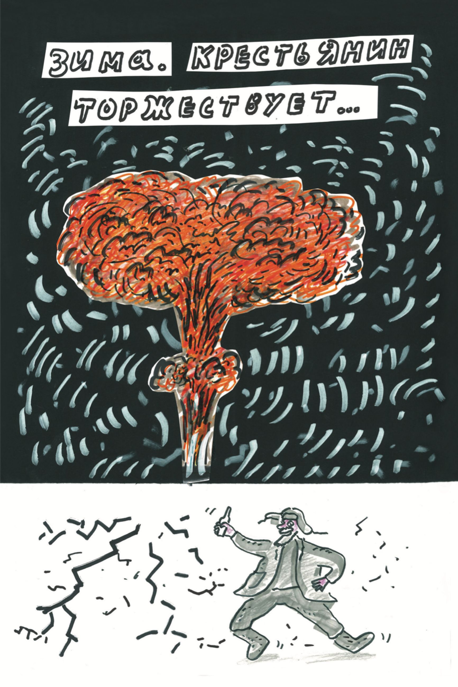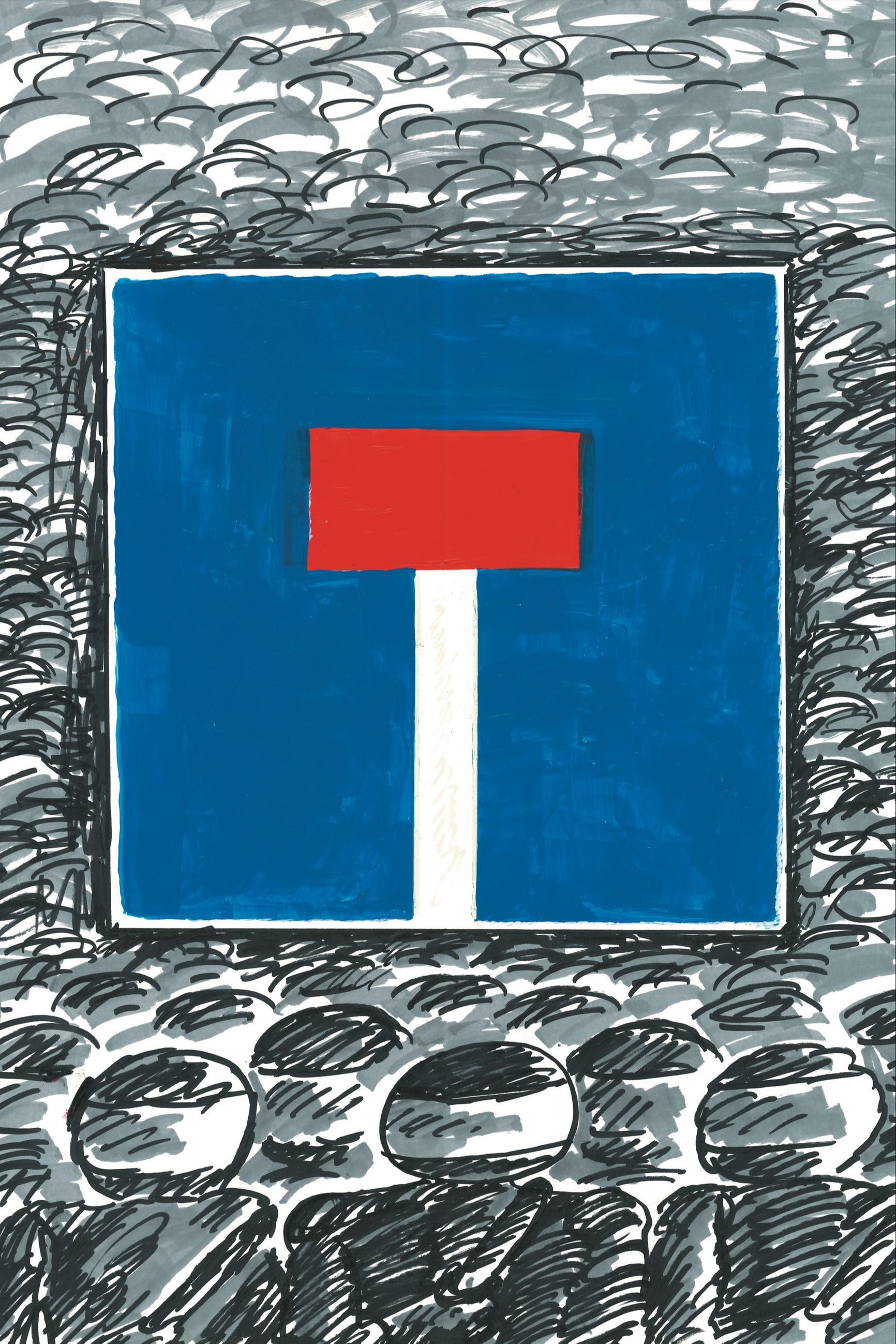 Эта картинка нарисована почти с натуры. Никогда не забуду 6 мая 2012 года, те минуты, когда мы приближались к Большому Каменному мосту. Он был пуст. Никакого движения не было — оно было перекрыто. Мост был частью свободной линии горизонта, из-за которой буквально в считанные секунды появилась черная полоса. Когда мы поняли, что это омоновцы, плотно стоявшие в несколько рядов, мы остановились и остолбенели. Это был тупик. Тупик в истории страны. Тогда мы еще не знали, что главный тупик нас ждет впереди.
