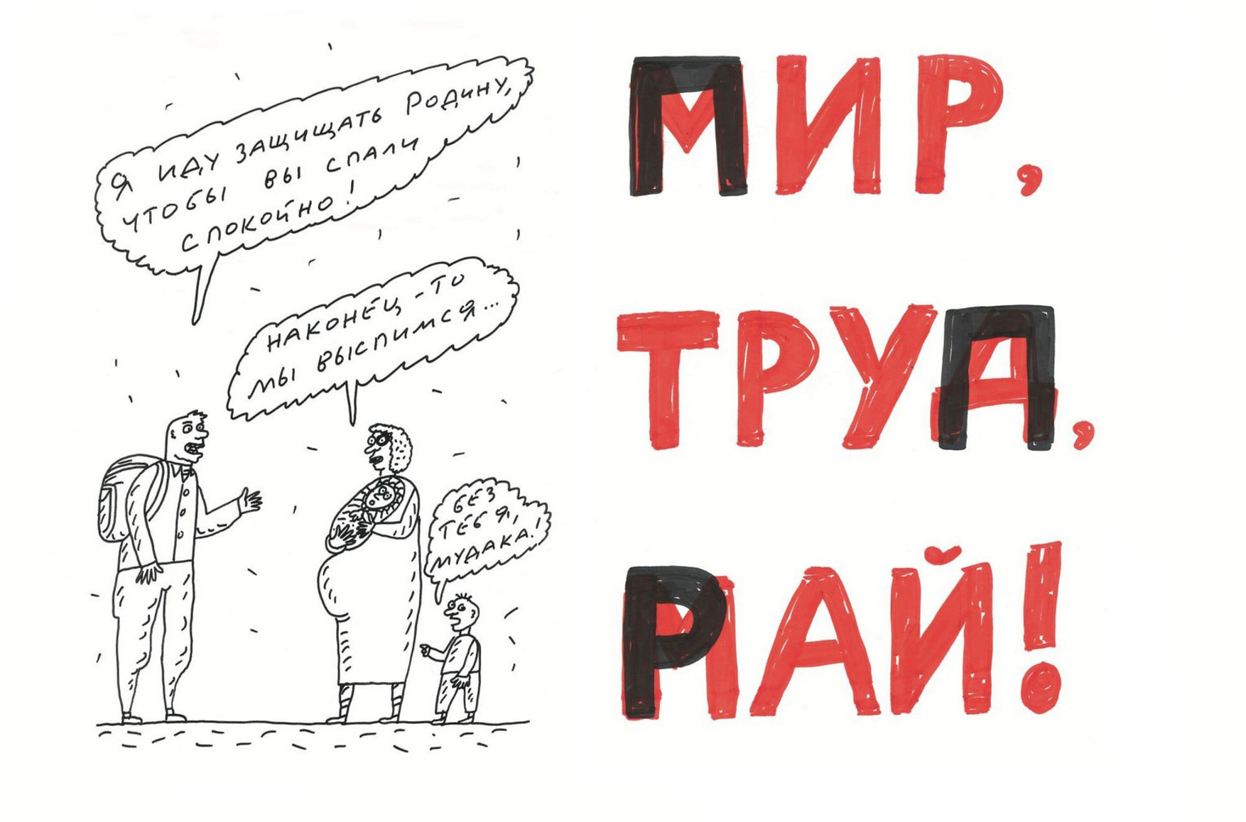 C началом полномасштабной войны художник, публицист и психиатр Андрей Бильжо заметил, как стремительно видоизменяется смысл самых простых слов — таких, как «наши», «родина», «государство»... Как эмоции, пропаганда, цензура, ощущение катастрофы заставляют заново осмыслять базовые понятия и определения. Тогда он создал серию рисунков «Азбука — 2022», которую опубликовал The Insider. За прошедшие три года «Азбука» превратилась в толстую книгу, выпущенную издательством Freedom Letters. Рисунки дополняются публицистическими комментариями автора, пояснениями редактора, справками из истории живописи и иногда «не поэзией» — энергичными и беспощадными авторскими высказываниями в форме белого стиха. Всё это вместе складывается в авторский букварь войны. С разрешения издательства The Insider публикует фрагменты новой книги.
