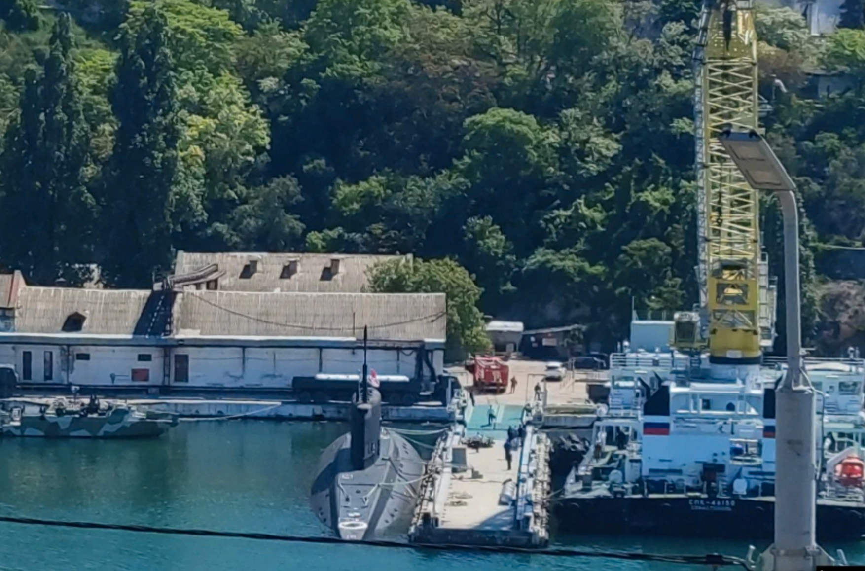 По его словам, у причалов в Южной бухте пришвартованы две подлодки, к одному из причалов два буксира притащили самоходный плавучий кран СПК-46150. На восточном берегу бухты стоят два «камаза», в кузове которых видны транспортно-пусковые контейнеры с ракетами, утверждает корреспондент.