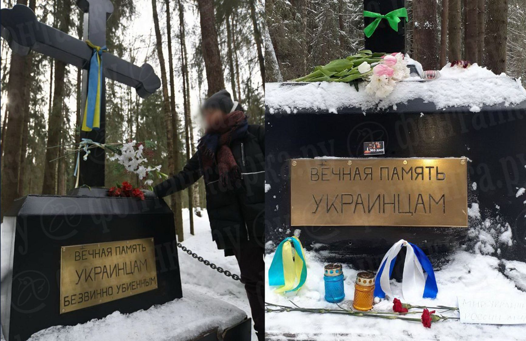 Изначально на табличке на кресте было написано «Вечная память украинцам безвинно убиенным». Памятник был установлен на Левашовском мемориальном кладбище в 2001 году и посвящен жертвам сталинских репрессий. Читательница «Фонтанки» рассказала, что приезжала на это же место в прошлом в марте. Тогда табличка была цела. На вопрос о том, что почему с нее убрали два слова, работник кладбища ответил: «Вы же понимаете, это не наша инициатива».