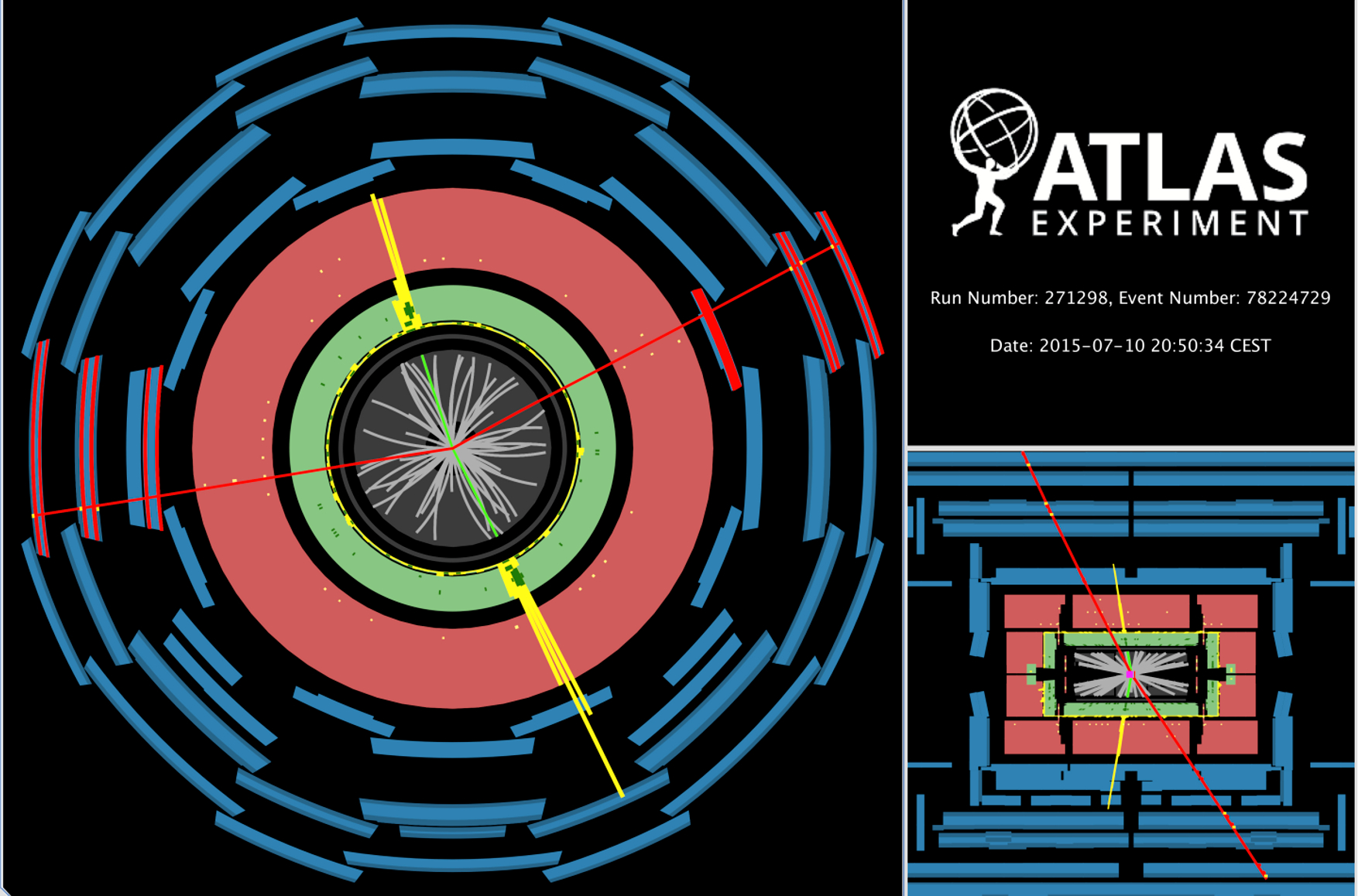 Рисунок: Изображение события распада бозона Хиггса на два Z-бозона, каждый из которых распадается на пару лептон-антилептон. Источник: ATLAS/ЦЕРН
