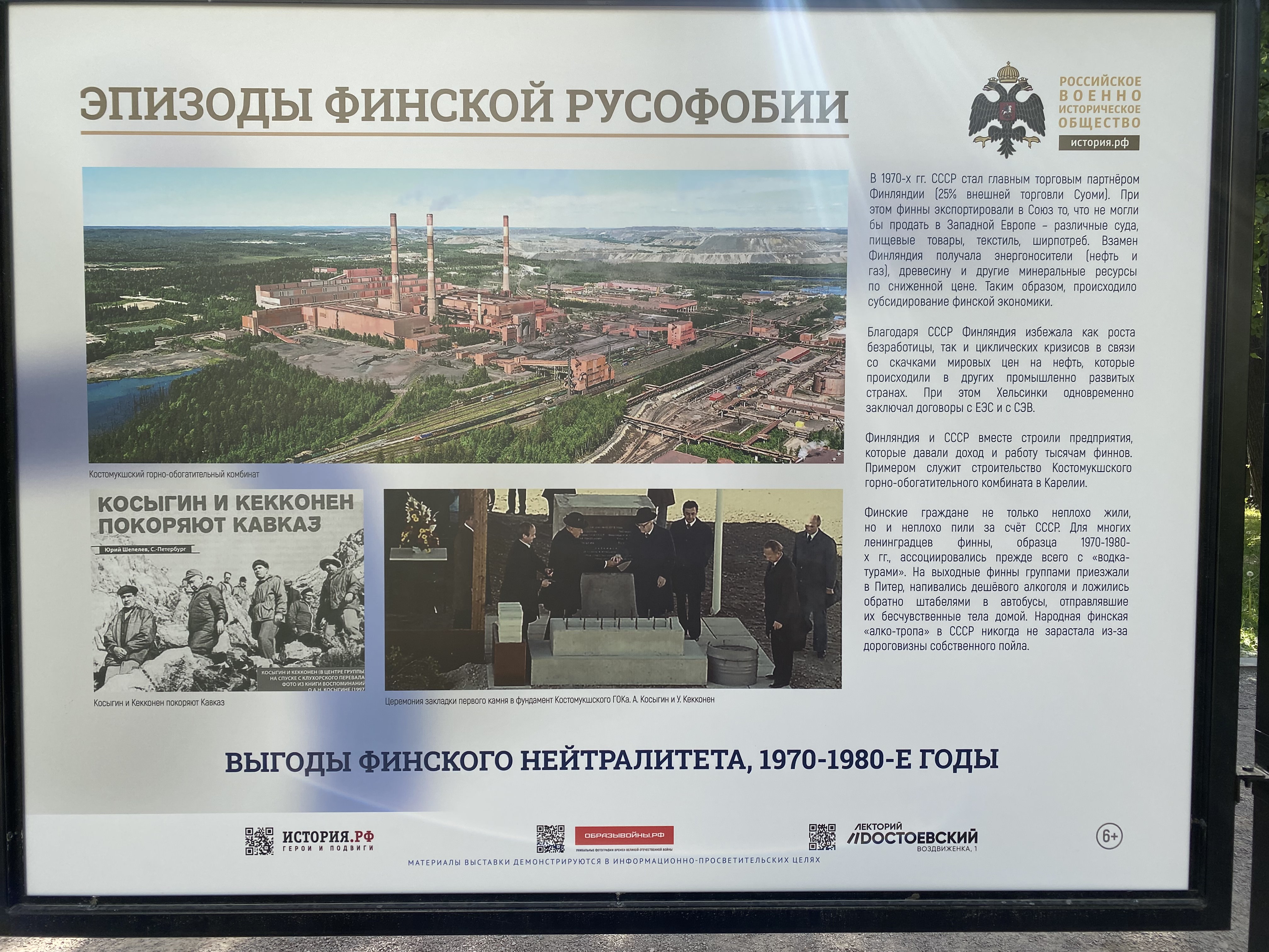 Выставка расположена сразу в трех местах: напротив посольства Финляндии в Кропоткинском переулке, по дороге от посольства к метро «Парк Культуры» на Остоженке и на Гоголевском бульваре. Текст на 16 стендах содержит множество орфографических и пунктуационных ошибок. В материалах делается акцент на том, что именно в составе России Финляндия обрела государственность и независимость, при этом именно «по вине финской стороны за первую половину ХХ в. наши страны, имели 4 вооруженных конфликта» (пунктуация и орфография авторов здесь и далее сохранены).