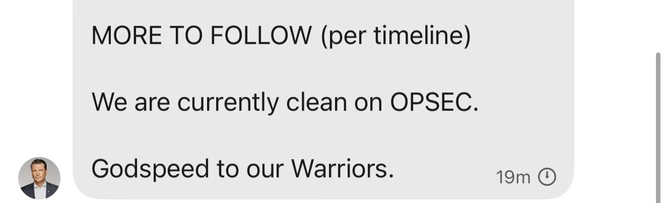 После этого участники чата начали поздравлять друг друга с успешным началом операции. Глава Пентагона Пит Хегсет также написал: «CENTCOM сработал безупречно. Отличная работа, команда. Удары продолжаются и будут идти еще несколько часов сегодня ночью. Завтра будет представлен первый отчет. Всё точно по цели, и уже есть хорошие данные»