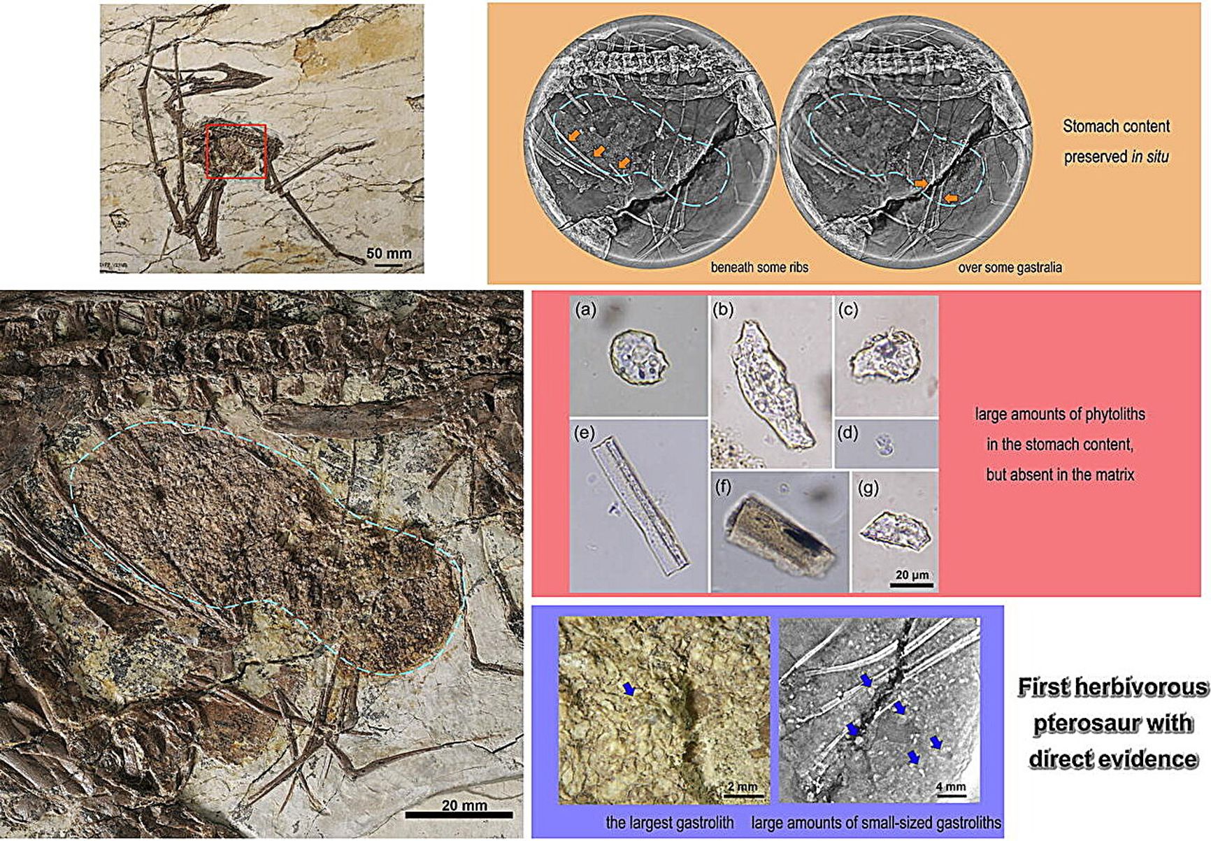Теперь же появились первые прямые свидетельства растительной диеты птерозавров. Ученые изучили окаменелость хорошо сохранившегося молодого птерозавра вида Sinopterus atavismus из нижнемеловых отложений формации Цзюфотан в западной провинции Ляонин, Китай. В желудке образца исследователи обнаружили более 320 мельчайших частиц растений (фитолиты).