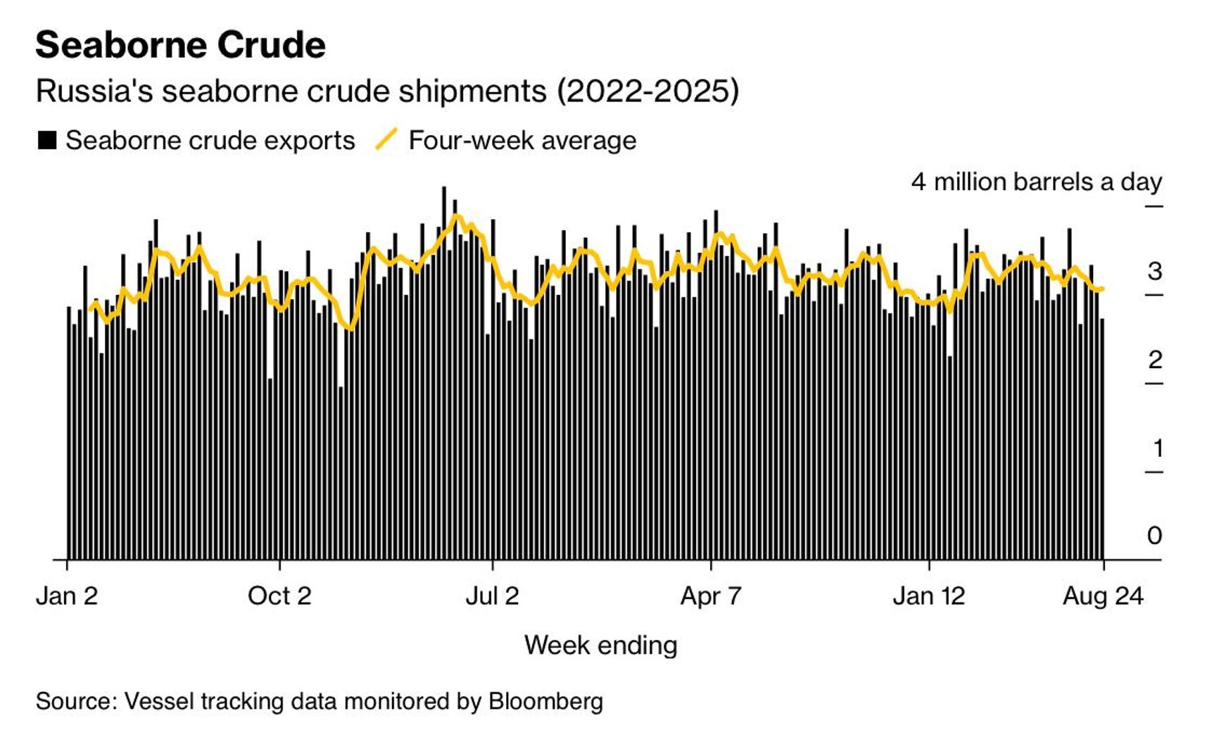 На прошлой неделе объем поставок российской нефти морем сократился до минимума за последние четыре недели, выяснило агентство Bloomberg. Это произошло на фоне ударов беспилотников по энергетической инфраструктуре внутри России и вступления в силу американских тарифов против Индии, которые Белый дом рассматривал как рычаг давления, чтобы Нью-Дели отказался от закупок российской нефти.