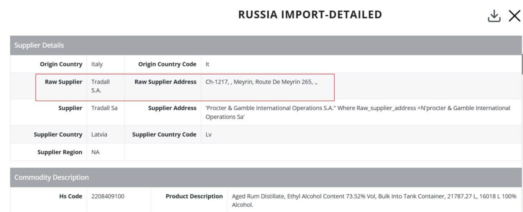 Так, шотландский виски William Lawson’s с 2016 года разливается на ООО «Завод Георгиевский. Традиции Качества», который входит в группу компаний Novabev (ранее Beluga). Розлив еще двух брендов Bacardi International перенесла в Россию уже после начала полномасштабной войны. В отличие от партнерства с Novabev, старт сотрудничества с «Тульским Винокуренным Заводом 1911» не освещался в пресс-релизах и привлек внимание лишь отраслевой прессы. 5 сентября 2023 года тульский завод получил декларации соответствия на импортное сырье — ромовые дистилляты и спирт джина производства Martini & Rossi S.p.A. Поставщиком выступила все та же швейцарская компания Tradall S.A., входящая в холдинг Бакарди. Фактически прибыль получает европейский завод-производитель, поставляющий сырье напрямую российским партнерам.