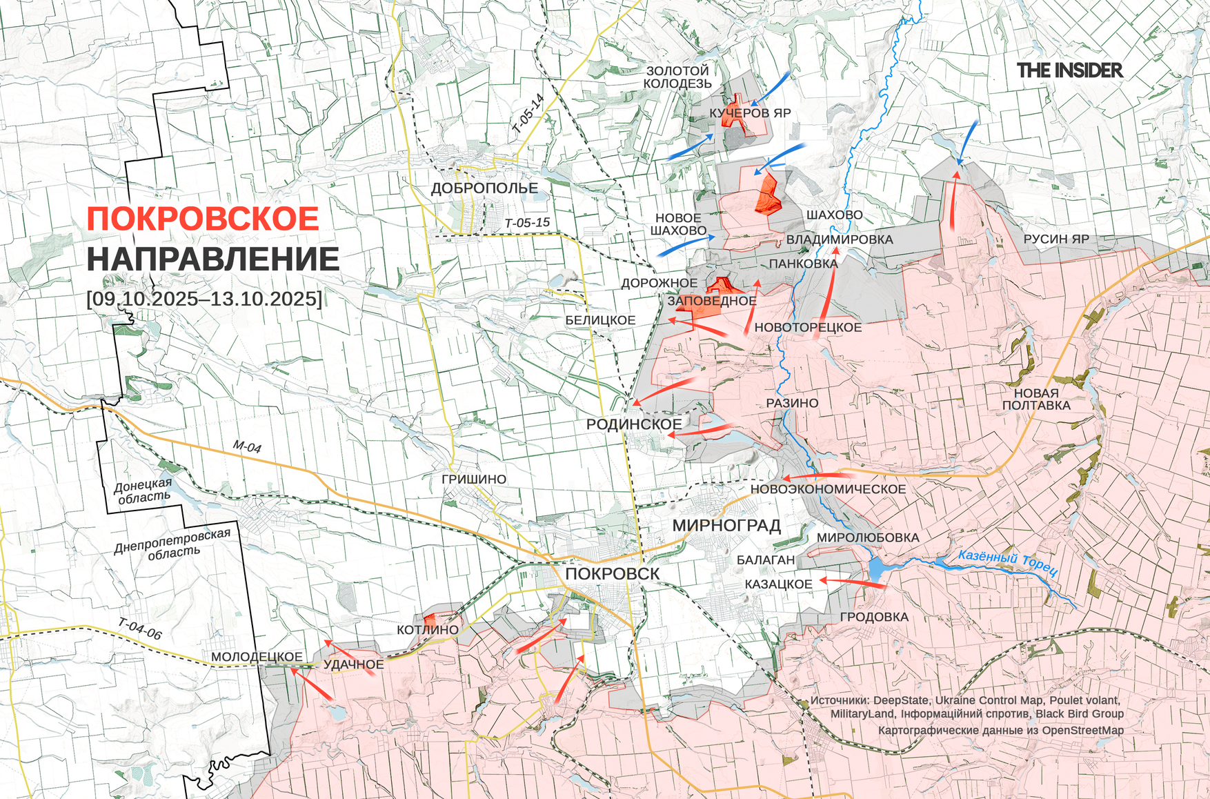 В DeepState сообщили 11 октября о продвижении ВС РФ в Заповедном (до 2024 года — Никаноровка) в районе Добропольского выступа и в Котлине (до 2016 года — Димитрово) к юго-западу от Покровска (до 2016 года — Красноармейск). Позже в проекте зафиксировали украинские контратаки в районе Нового Шахова (до 2016 года — Розы Люксембург), Золотого Колодезя и Кучерова Яра по периметру выступа, а также около Новопавловки к востоку от него. В то же время, по оценке аналитиков проекта, ВС РФ в ходе боев за выступ продвинулись в Кучеровом Яре и в районе Шахова (до 2016 года — Октябрьское).