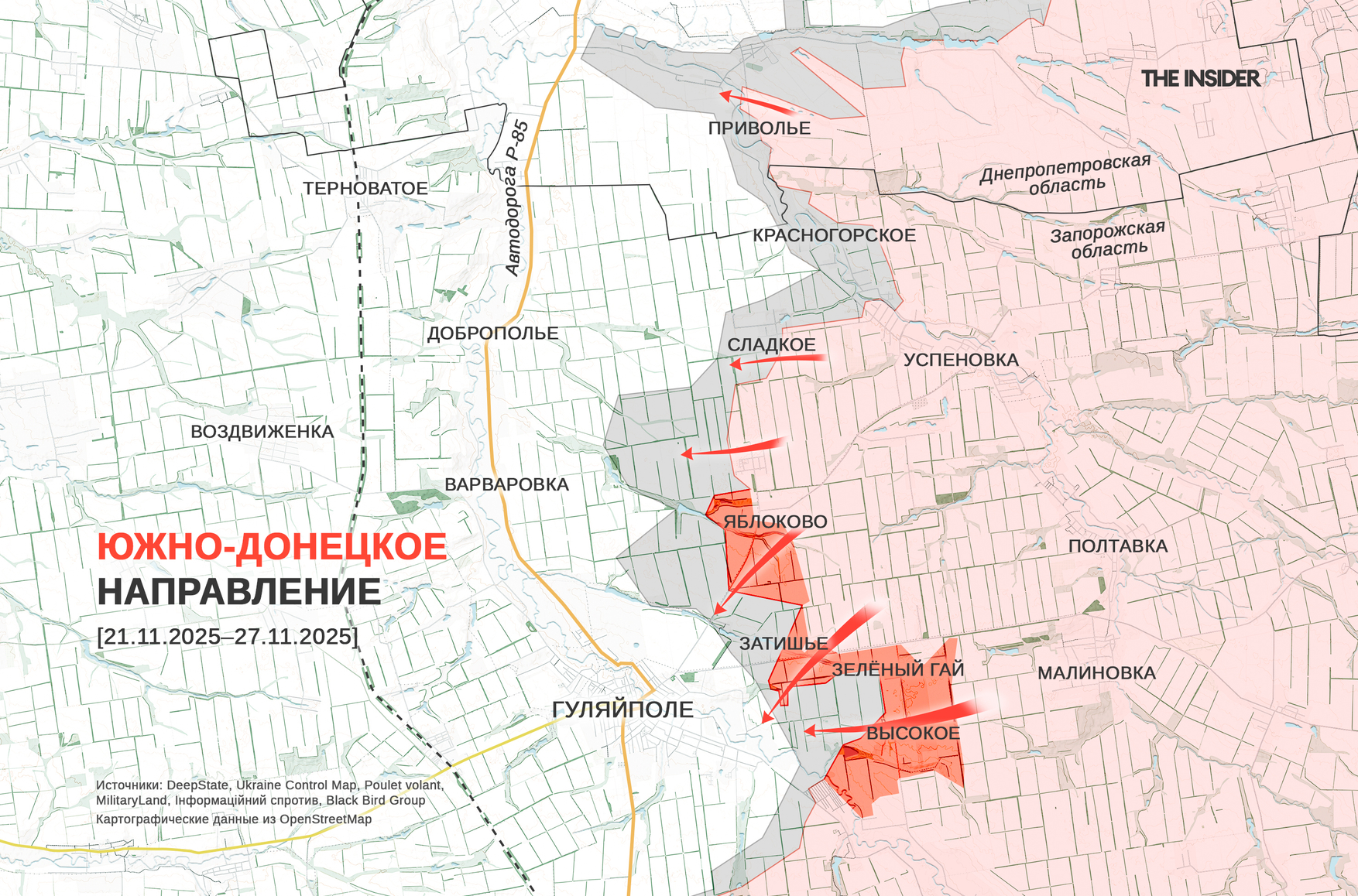 В DeepState сообщили о захвате Зелёного Гая и продвижении ВС РФ в районе Высокого и Яблокова под Гуляйполем в Запорожской области. Аналитики рассказали, что СОУ удалось стабилизировать рубеж обороны непосредственно перед Гуляйполем, хотя до этого в этом районе с украинской стороны царил хаос, выражавшийся в самовольном отходе с позиций и случаях огня по своим. Также, по сведениям проекта, к западу от Зелёного Гая российские военные расстреляли пятерых украинских военнопленных. «Военкор» Котенок в свою очередь сообщил о начале боев за Гуляйполе, а также о выходе ВС РФ к Варваровке и заходе в Доброполье к северо-западу от города.