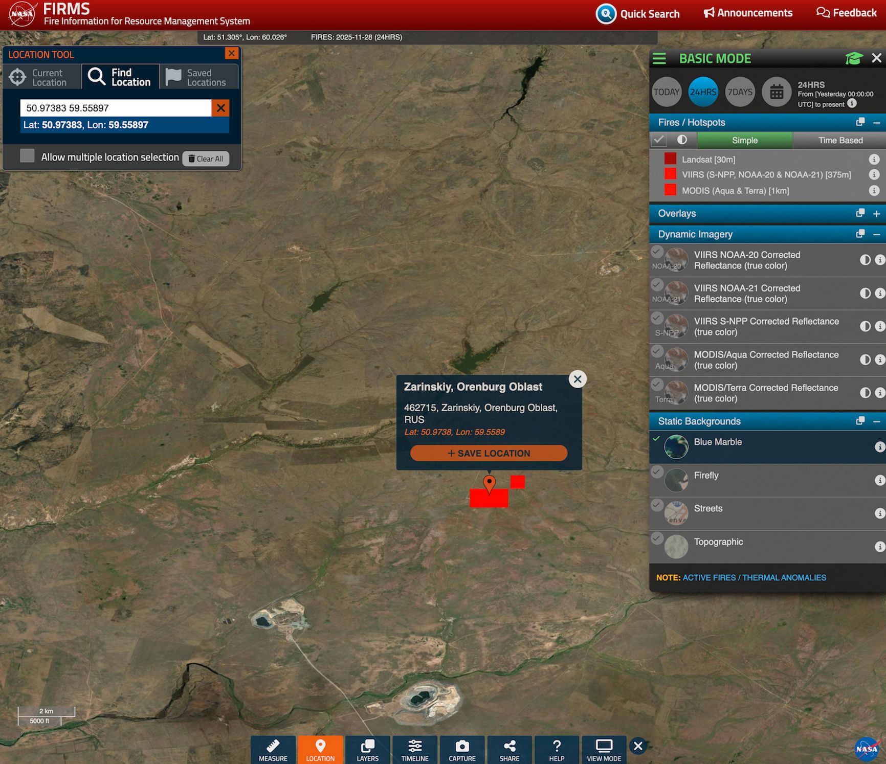 На сервисе отображения пожаров NASA FIRMS видно возгорание в районе полигона.