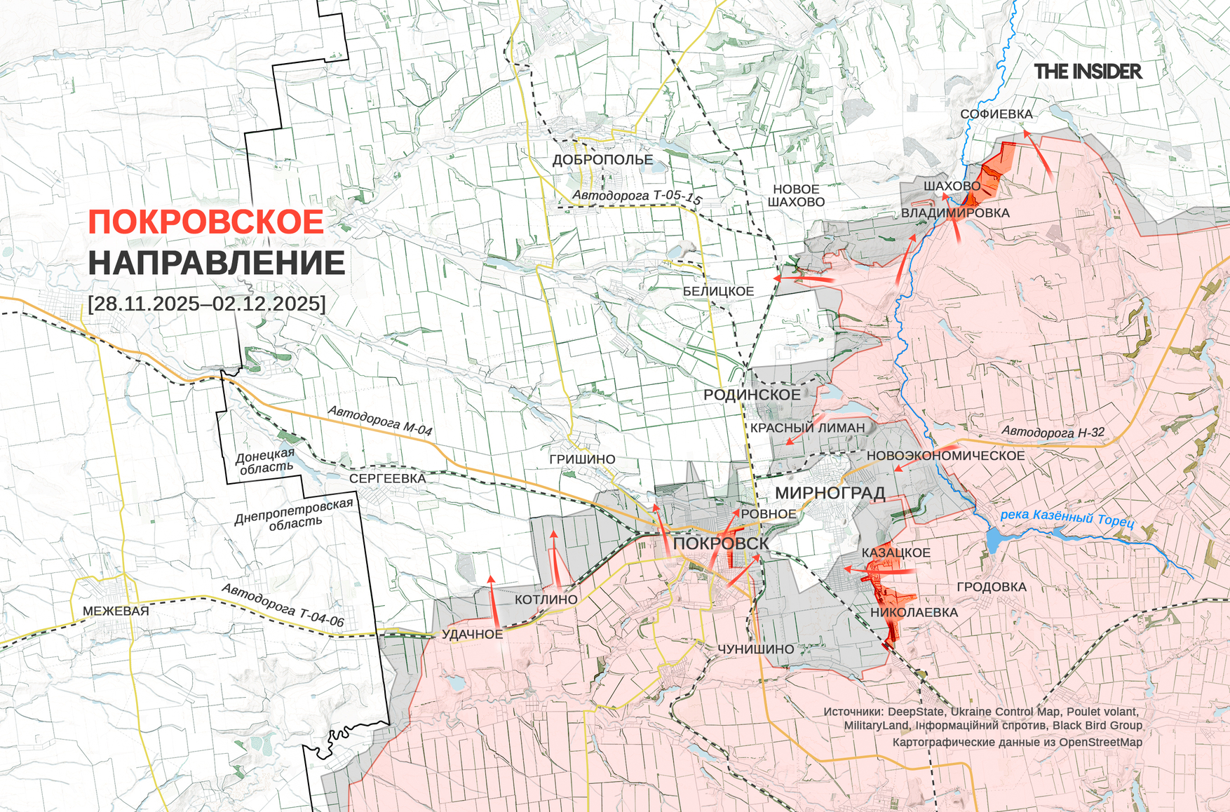 «Военкор» Юрий Котенок в свою очередь сообщает о продвижении ВС РФ в Гришине также к северо-западу от Покровска и о продолжающихся городских боях в Мирнограде. У основания Добропольского выступа, по сведениям «военкора», российские войска заняли Новое Шахово (до 2016 года — Розы Люксембург) и южную часть Софиевки (до 2016 года — Артëмовка).
