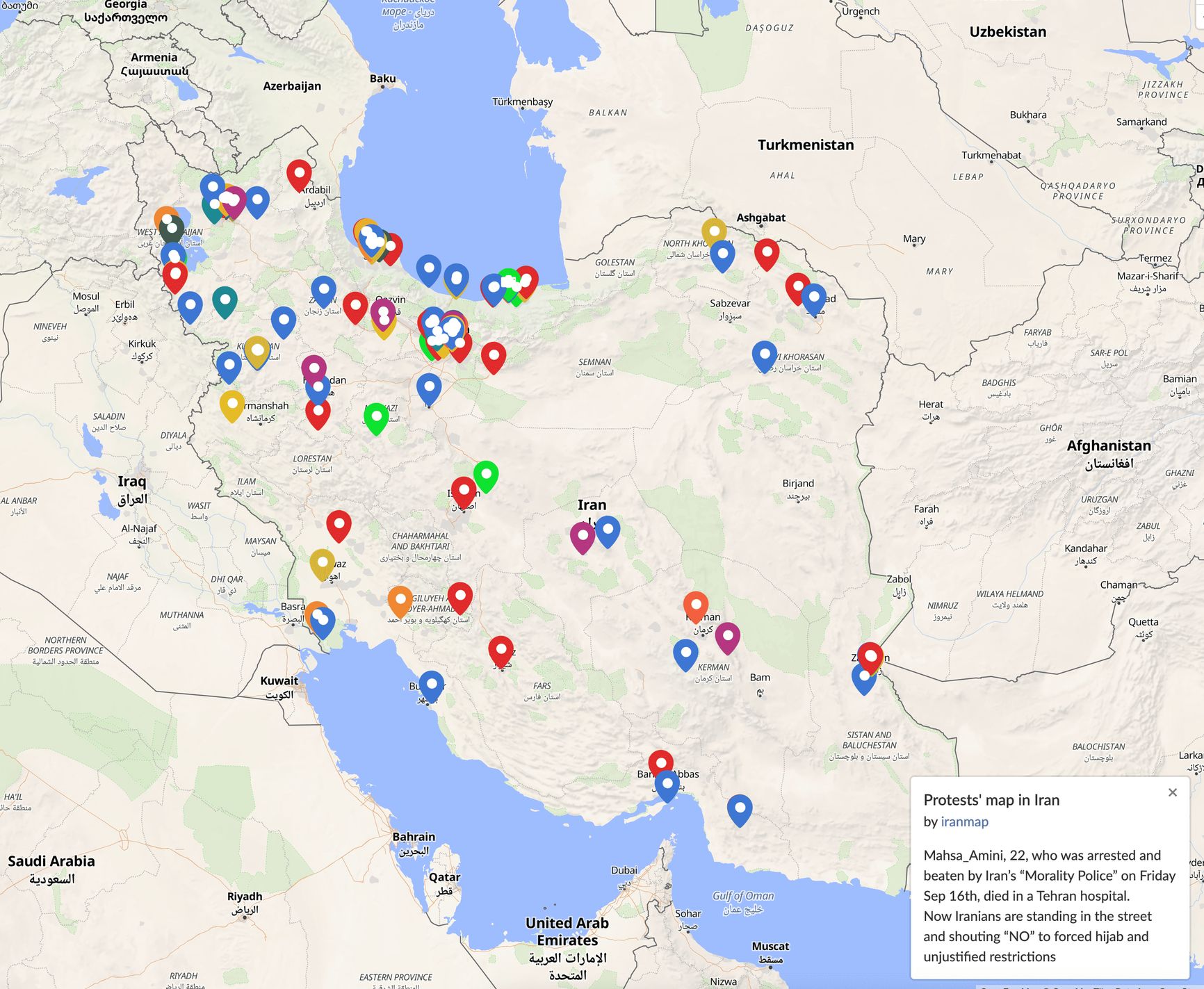 По имеющейся информации, двое человек погибли в городе Лордеган на юго-западе страны, трое — в городе Азна в провинции Лорестан, еще один человек — в Кухдаште на западе Ирана. Акции проходят также в Тегеране и Марвдаште в южной провинции Фарс.