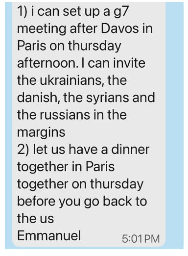 В опубликованном Трампом сообщении Макрон предлагает провести в Париже встречу членов G7 в предстоящий четверг: «Я могу пригласить украинцев, датчан, сирийцев и россиян в качестве наблюдателей», — пишет он. Само сообщение начинается так: