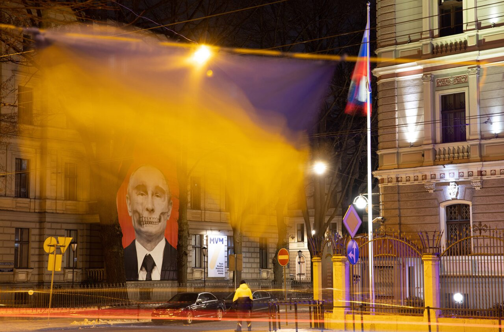 Фото: плакат с «черепом Путина» напротив российского посольства в Риге / Bloomberg