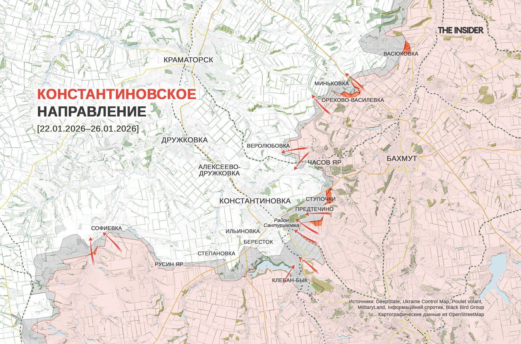 Исследователь под ником Playfra рассказывает, что 23–25 января ВС РФ безуспешно атаковали Константиновку со стороны Предтечина. Также не удалось продвинуться вглубь города с юго-востока — незначительное присутствие сохраняется только на окраине района Сантуриновка. К югу от города они смогли зайти в Бересток, где до сих пор присутствуют российские военные, а также в северную часть Степановки, где, впрочем, штурмовики были уничтожены, рассказывает исследователь. Также он сообщает, что ВС РФ продолжают дистанционное минирование практически всей Константиновки и дорог, ведущих в город, а также атакуют украинскую логистику с помощью дронов. В бригаде «Хижак» Патрульной полиции Украины показали на видео, насколько сложно осуществлять ежедневное снабжение СОУ в Константиновке.