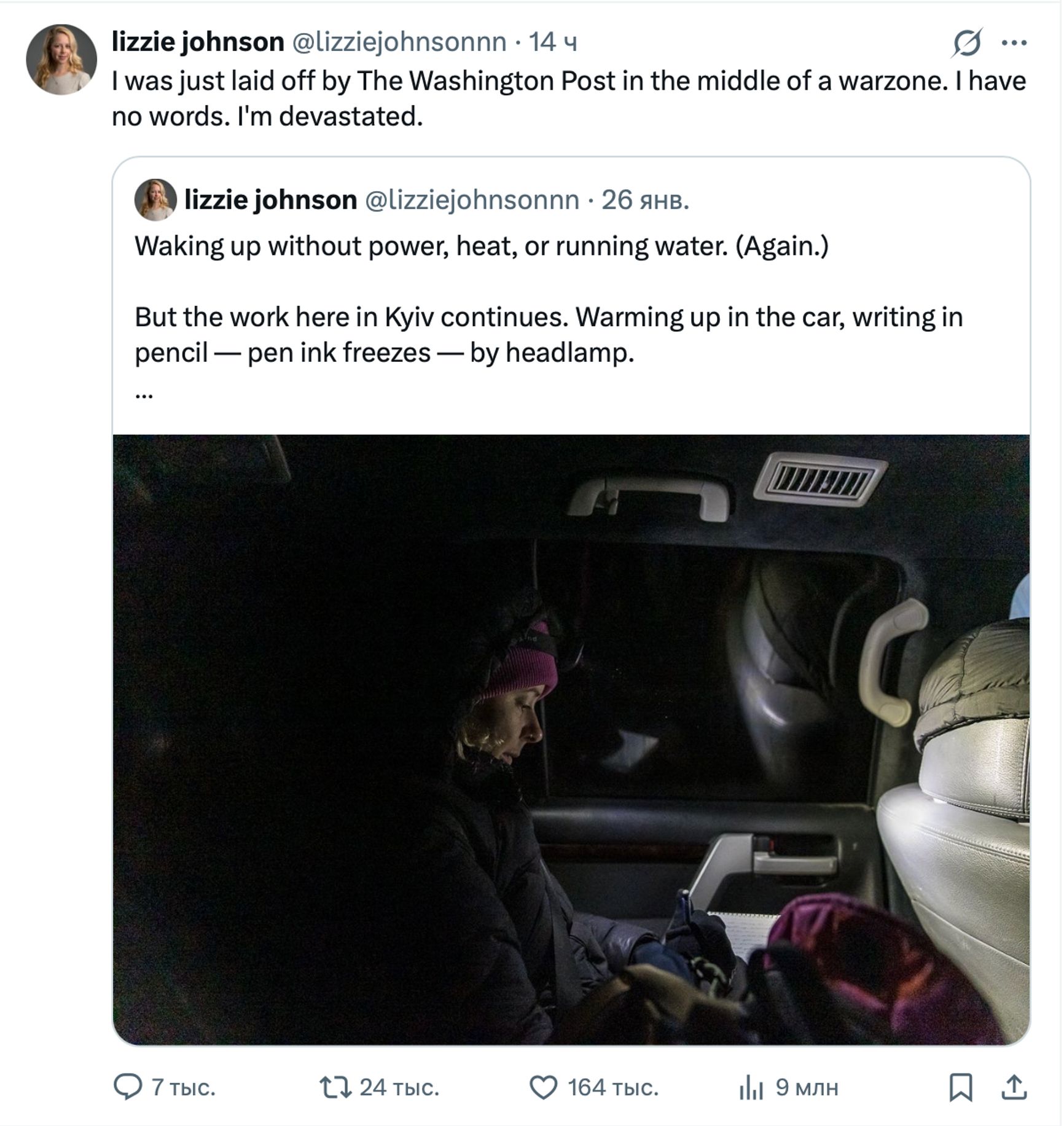 «Меня уволили из The Washington Post прямо в зоне военных действий. У меня нет слов. Я опустошена», — написала в Twitter корреспондент Лиззи Джонсон.