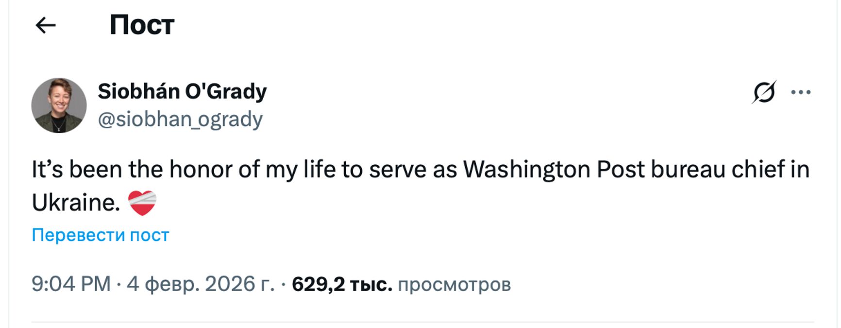 О закрытии украинского бюро написала и его руководитель Шивон О’Грейди: «Работа главой бюро Washington Post в Украине была величайшей честью в моей жизни».