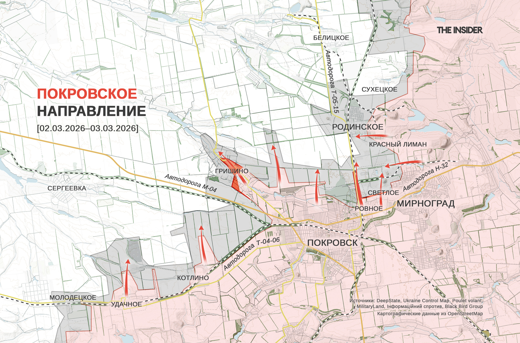 OSINT-группа Black Bird Group, в свою очередь, оценила, что в феврале 2026 года ВС РФ потеряли в общей сложности 37 кв. км территории — по их подсчетам, площадь оккупированных территорий сократилась по итогам месяца впервые с ноября 2023 года.