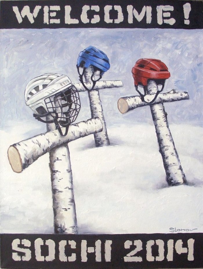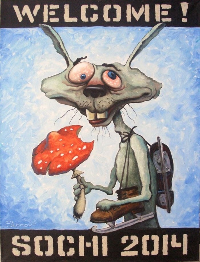 В 2014 году Марат Гельман, тогда еще директор Пермского государственного музея современного искусства, готовил выставку Василия Слонова «Welcome to Sochi». Серия работ затрагивала чувствительную историю с личным пиаром президента и спортвошингом, которым Олимпиада в Сочи и являлась.