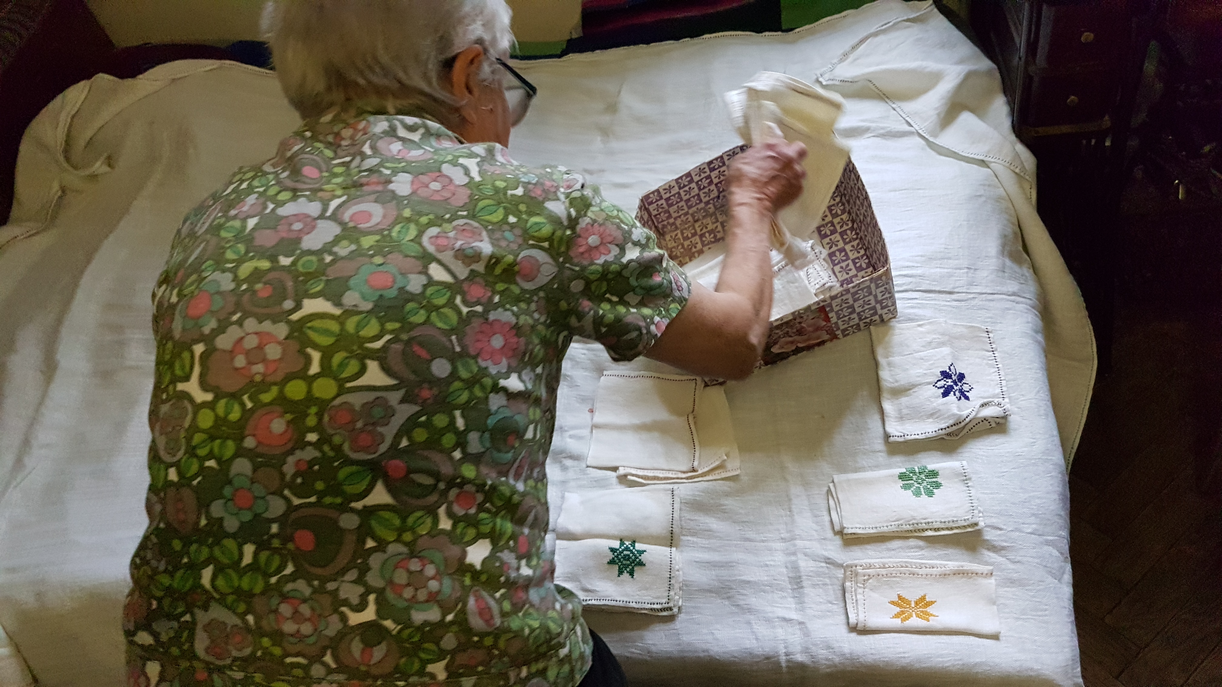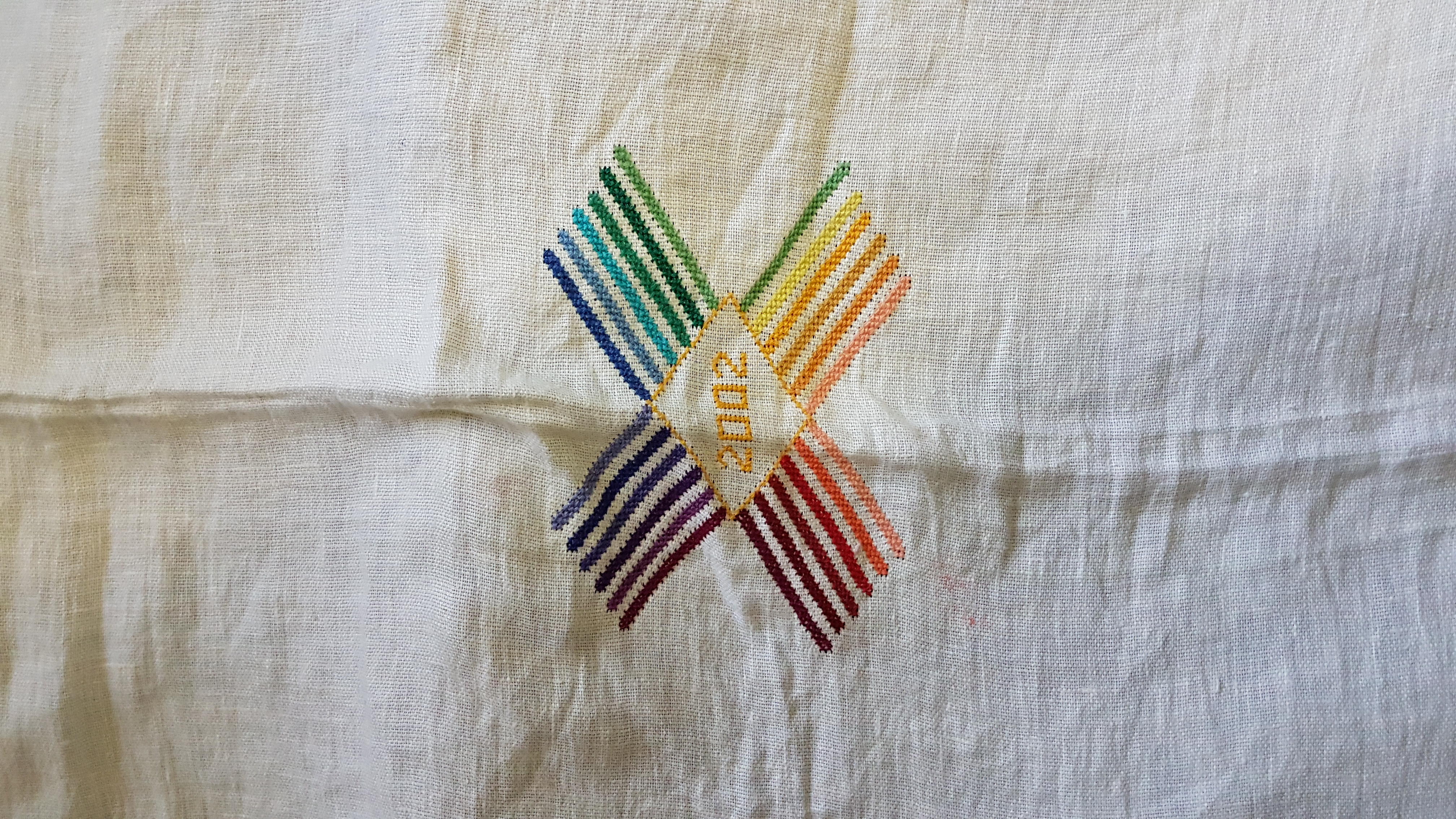 Да, мне о ней еще весной внучка напомнила. Я начала ее вышивать в 2002 году, в центре – символ солнца, вся вышивка – в цветах радуги. Кроме скатерти, есть еще салфетки – на каждой звезда, как символ человека. Только я не все еще вышила. Такие же звезды я хочу нашить на скатерти. Хочу, чтобы мои дети, внуки и правнуки застилали ею стол на свадьбу. Я очень люблю шить, хотя с такими пальцами это становится сложно. Но когда я шью, то успокаиваюсь. Это моя отдушина. Но я пока скатерть так и не дошила, поэтому и власть не сменилась. Каюсь.