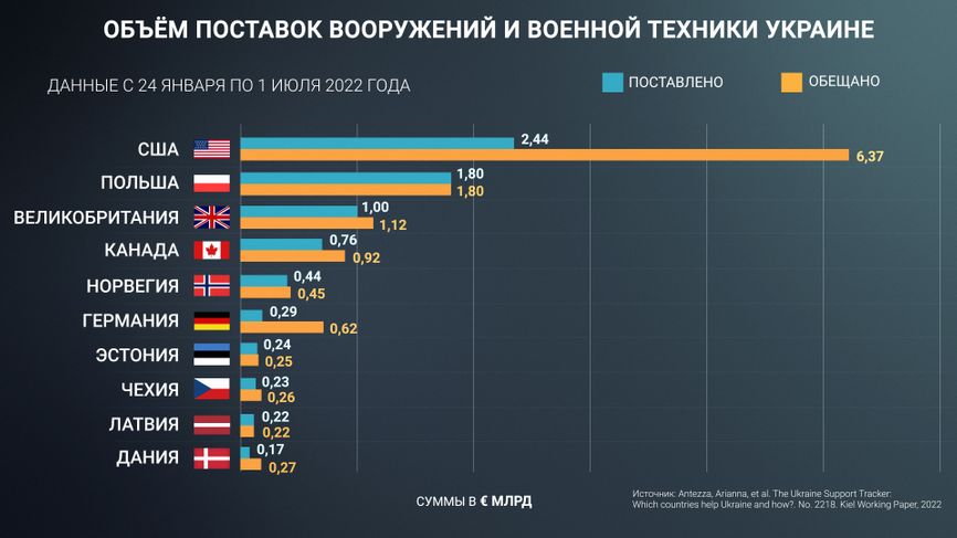 Советник главы Офиса президента Украины Михаил Подоляк написал 13 июня, что для завершения войны Киеву необходимо 1000 гаубиц калибра 155 мм, 300 реактивных систем залпового огня, 500 танков, 2000 единиц бронетехники, 1000 беспилотных летательных аппаратов. Пока что из этого объема, за исключением танков, поставлено крайне незначительное количество, но следует учитывать, что США не начали отгрузки в рамках программы ленд-лиза.