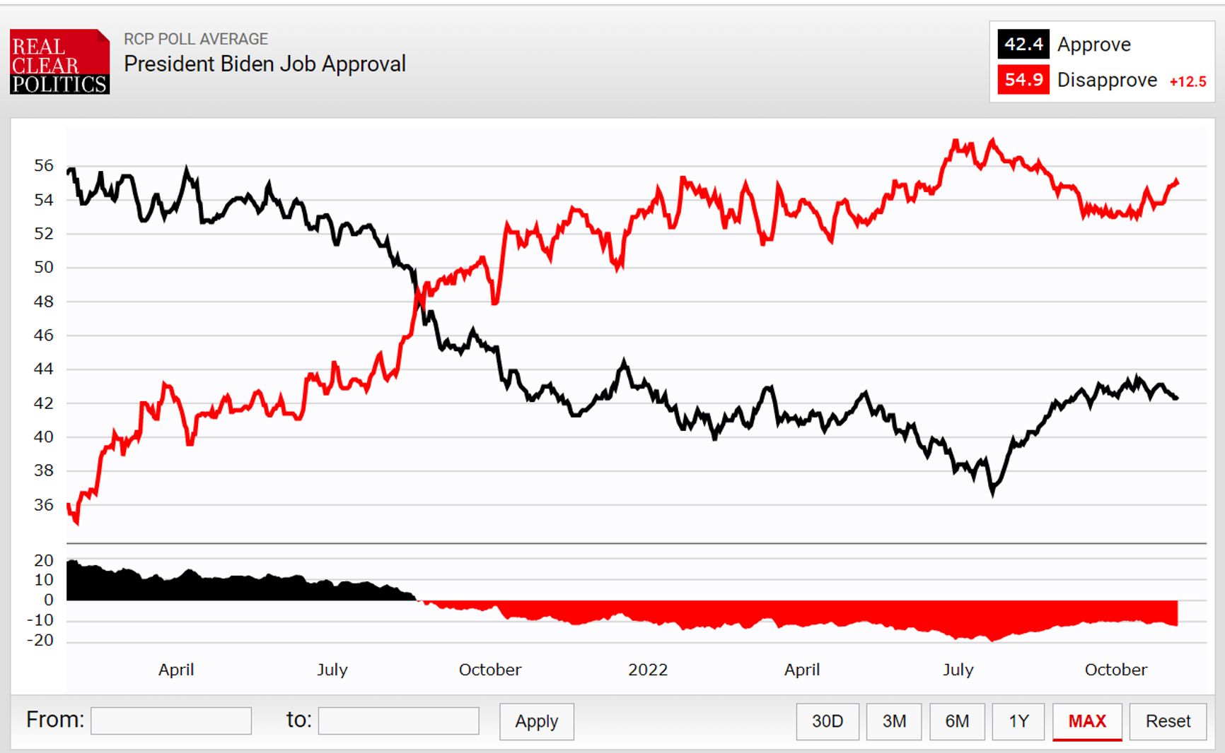 Исторически складывается так, что на первых промежуточных выборах партия, занимающая Белый дом, теряет в среднем 20–30 мест в Конгрессе (исключение составили 1986, 1998 и 2002 годы, когда партия президента не только не теряла, но и получала несколько мест). При этом рейтинг самого Байдена, сильно просевший после выборов, в последние месяцы подтянулся до вполне достойных 42–43% (для сравнения: рейтинг Трампа за все четыре года его президентства редко поднимался выше этих показателей).
