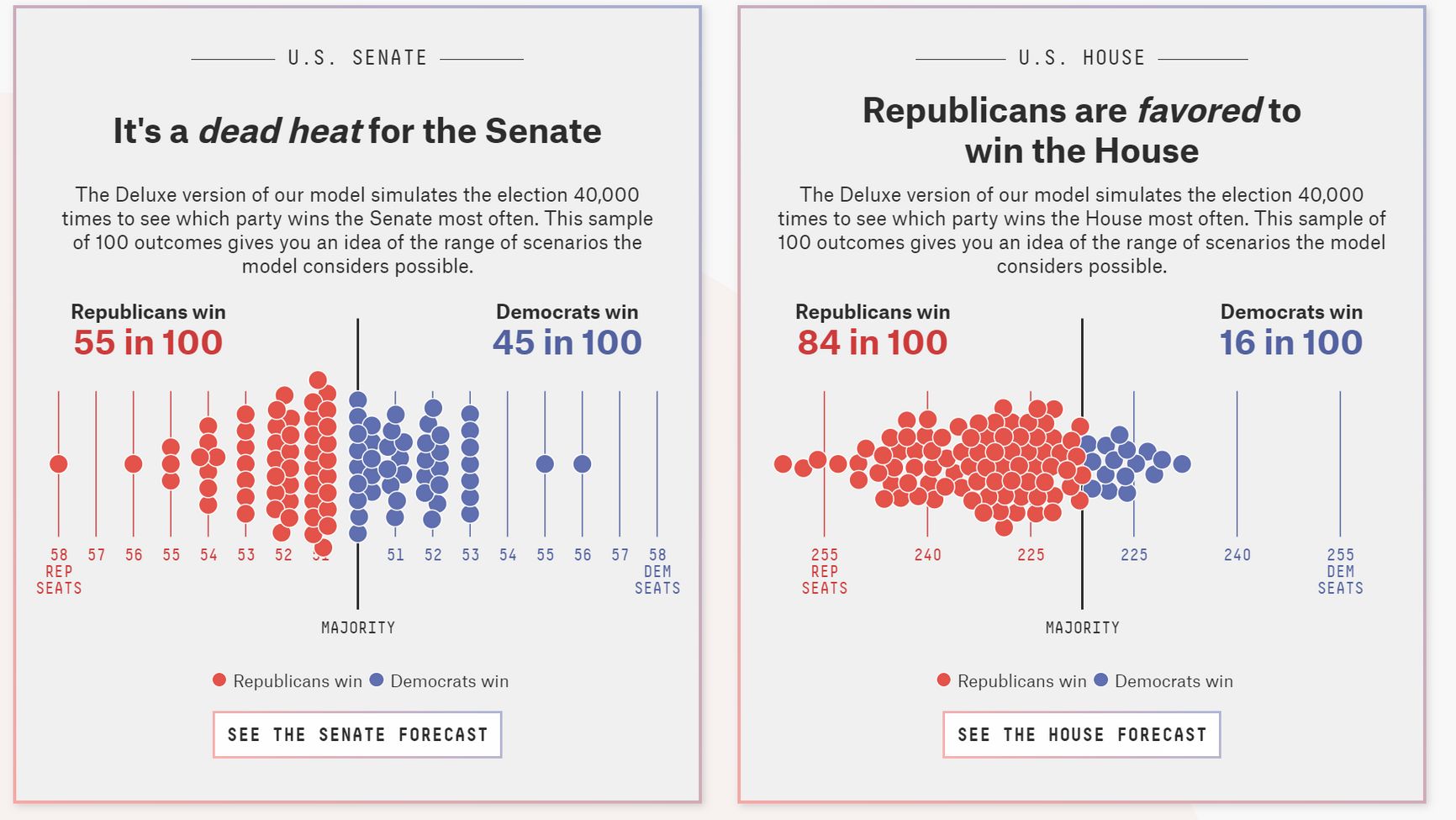Математически шанс взять обе палаты есть у обеих партий, но для демократов эта перспектива малореальна. Скажем, проект Fivethirtyeight, специализирующийся на предвыборных прогнозах в США, оценивает ее лишь в 15%, а вот для республиканцев эта вероятность больше 50%: