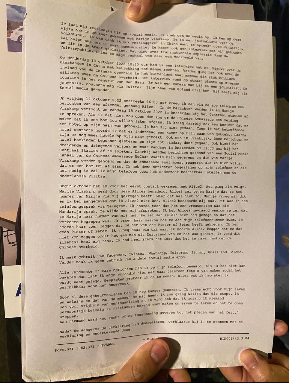 «9 июня 2022 года я получил сообщение с неизвестного номера о том, что некий китайский спецагент, находящийся в Германии, якобы должен приехать в Нидерланды, чтобы убить меня. Конечно же, мне в это не верилось, но я на всякий случай позвонил в голландскую полицию и сказал, что мне угрожают убийством».