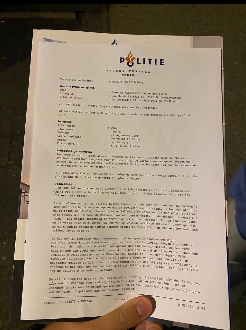 «Я думал, что в Нидерландах я буду в полной безопасности. Но я снова ошибся. Китайская полиция всё время названивала мне — кажется, более тысячи раз. При этом они звонили мне с официального номера 110, этот номер они используют и в Китае. Говорили, что хотят поговорить со мной. Просили меня подумать о родителях, о семье, над которой у них есть власть. Когда я впервые сообщил об этом голландской полиции, мне сказали, что это, конечно, незаконно, но они не могут ничего сделать — ведь мне угрожала не голландская полиция».
