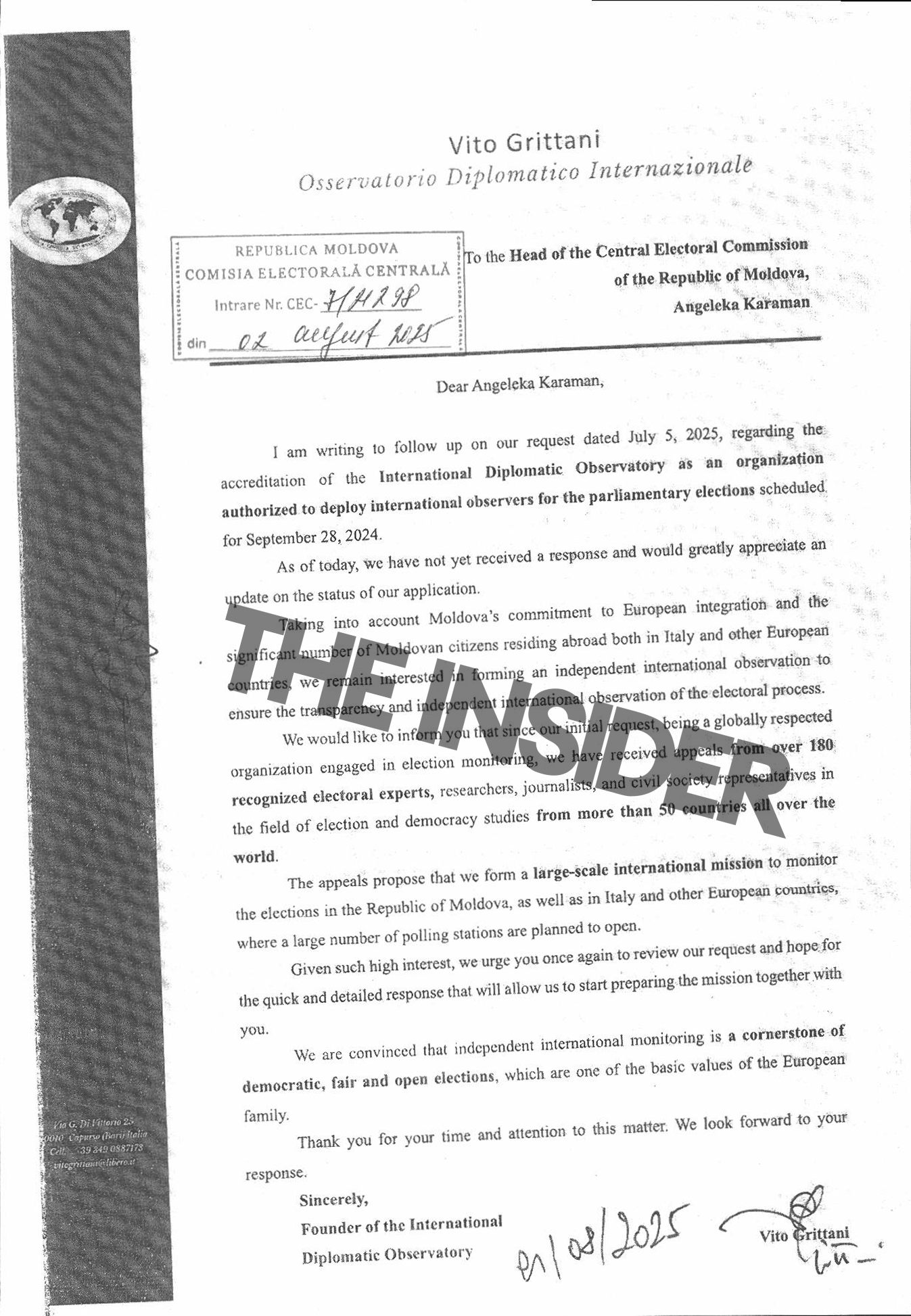 Еще одно письмо, с которым ознакомился The Insider, — от основателя Международной дипломатической обсерватории (Osservatorio Diplomatico Internazionale) Вито Гриттани. Несмотря на итальянское происхождение, Гриттани в первую очередь известен как наблюдатель со стажем для аудитории российских госагентств.