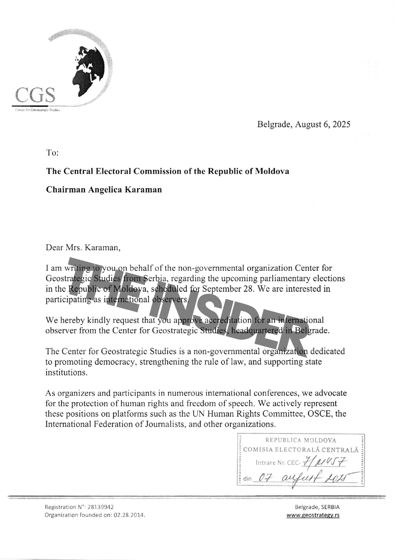 В своем письме глава Центра утверждает, что CGS занимается продвижением демократии и верховенства права. Организация неоднократно писала и о Молдове, в том числе делая заявления о том, что большинство граждан страны «скептически относится к идее евроинтеграции», что было опровергнуто результатами референдума.